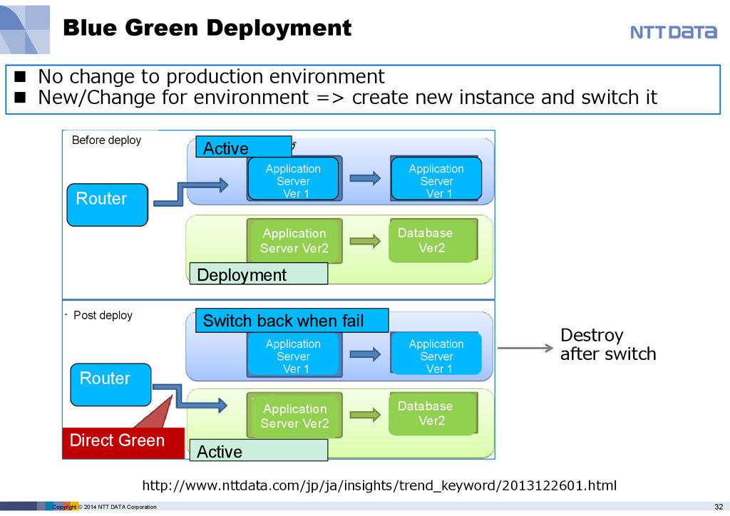 http://www.nttdata.com/jp/ja/insights/trend_keyword/2013122601.html No change to production environment New/Change for environment => create new instance and switch it Destroy after switch Before deploy Post deploy Router Router Application Server Ver 1 Application Server Ver 1 Application Server Ver 1 Application Server Ver 1 Application Server Ver2 Database Ver2 Application Server Ver2 Database Ver2 Active Deployment Switch back when fail Active Direct Green