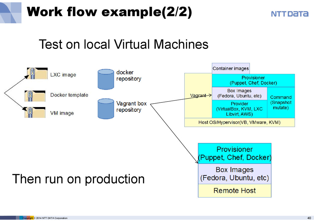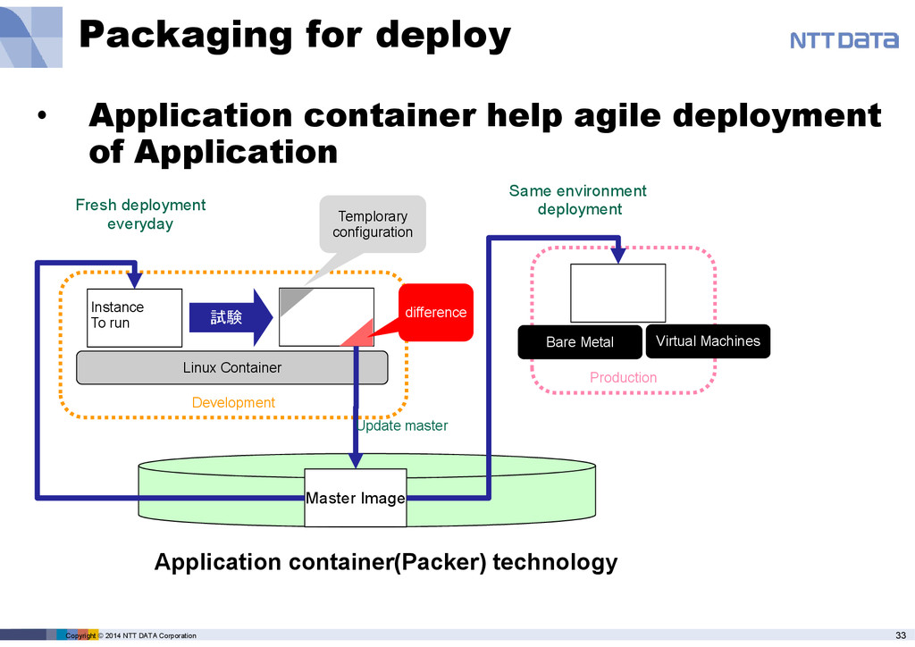 • Application container help agile deployment of Application Production Development Bare Metal Linux Container Master Image 試験 difference Templorary configuration Update master Same environment deployment Fresh deployment everyday Application container(Packer) technology Virtual Machines Instance To run