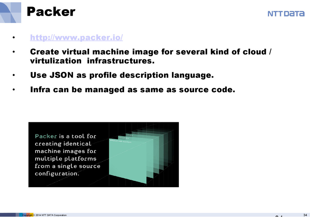 • Create virtual machine image for several kind of cloud / virtulization infrastructures. • Use JSON as profile description language. • Infra can be managed as same as source code.