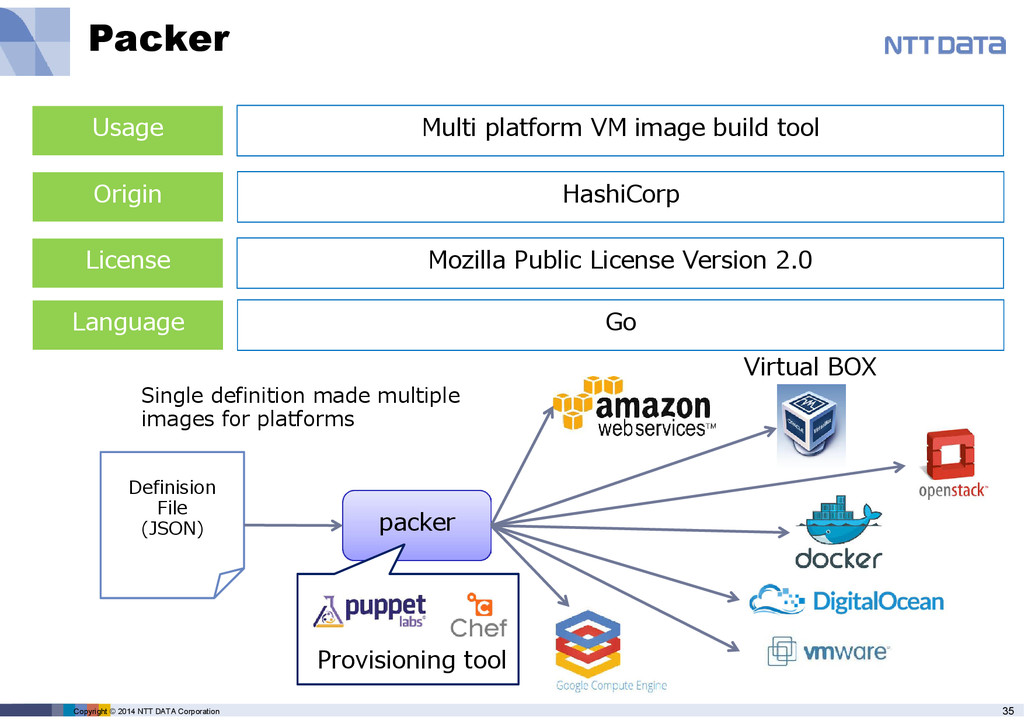 platform VM image build tool Origin HashiCorp License Mozilla Public License Version 2.0 Language Go Definision File (JSON) packer Virtual BOX Single definition made multiple images for platforms Provisioning tool