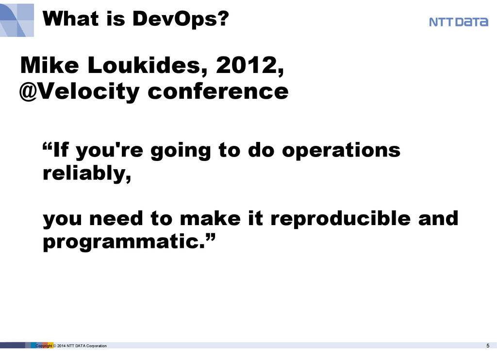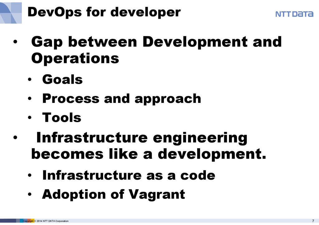 • Gap between Development and Operations • Goals • Process and approach • Tools • Infrastructure engineering becomes like a development. • Infrastructure as a code • Adoption of Vagrant