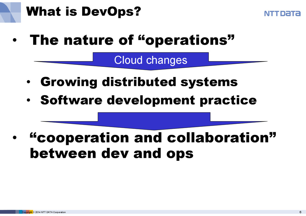 • The nature of “operations” • Growing distributed systems • Software development practice • “cooperation and collaboration” between dev and ops Cloud changes