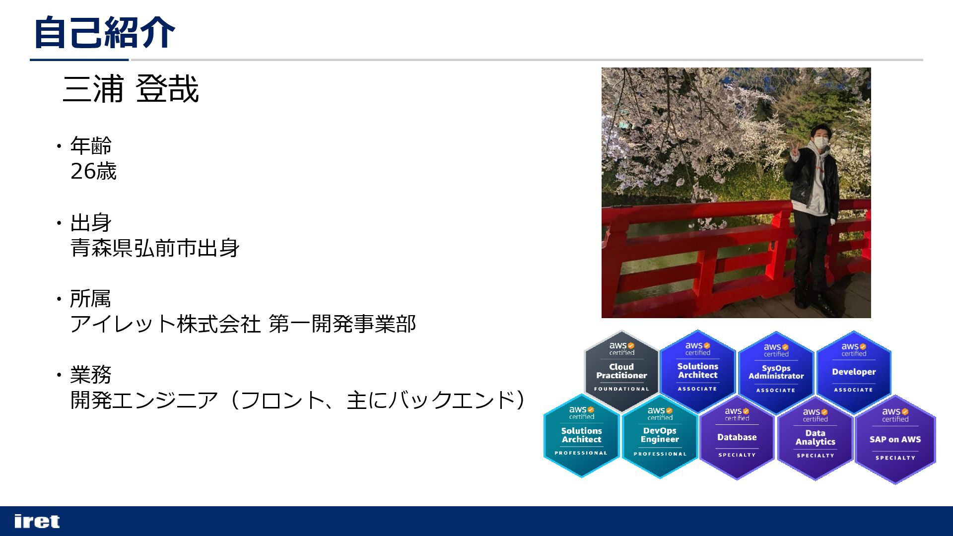 ・年齢 26歳 ・出身 青森県弘前市出身 ・所属 アイレット株式会社 第一開発事業部 ・業務 開発エンジニア(フロント、主にバックエンド) 三浦