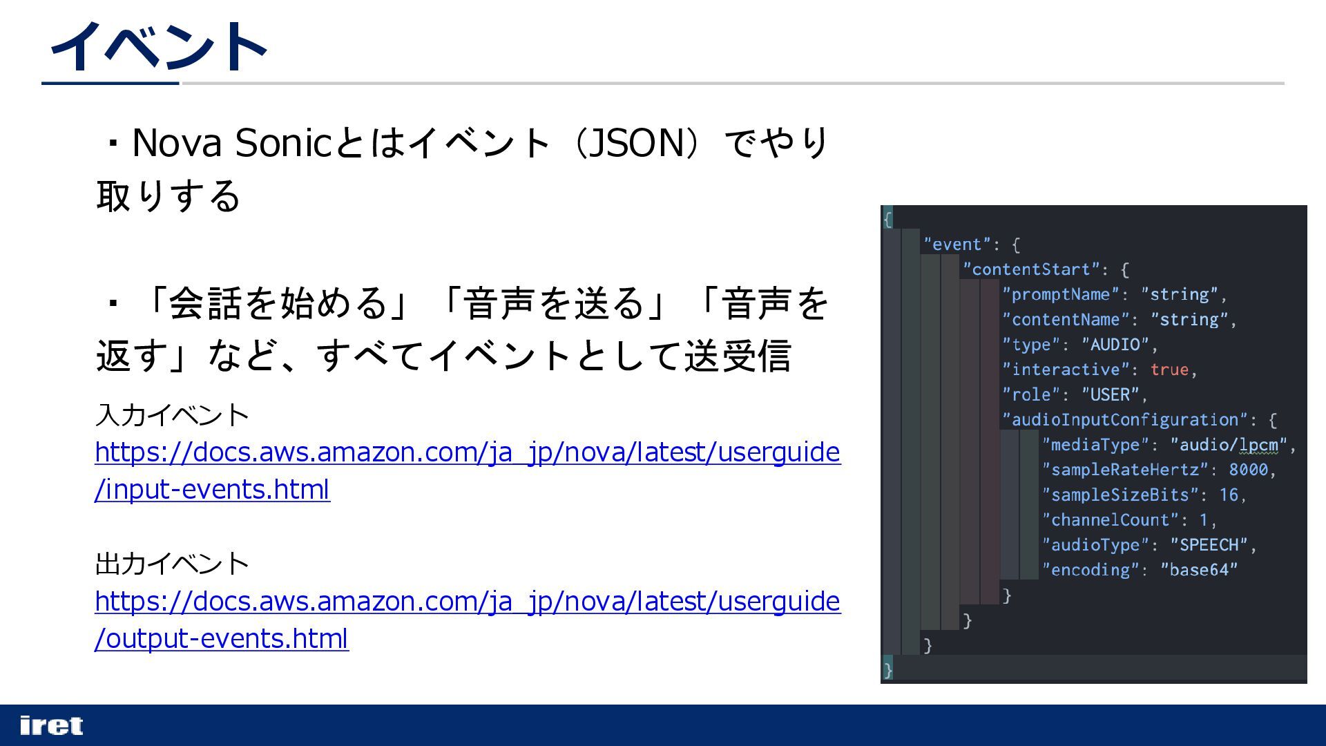 ・Nova Sonicとはイベント(JSON)でやり 取りする ・「会話を始める」「音声を送る」「音声を 返す」など、すべてイベントとして送受信 入力イベント https://docs.aws.amazon.com/ja_jp/nova/latest/userguide /input-events.html 出力イベント https://docs.aws.amazon.com/ja_jp/nova/latest/userguide