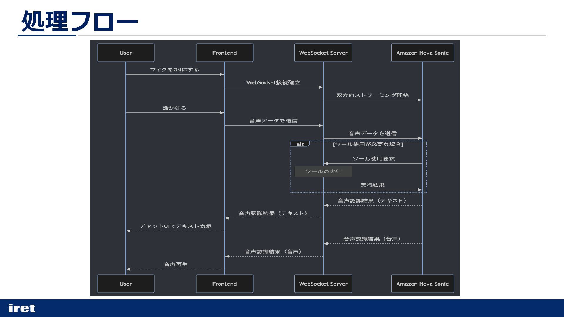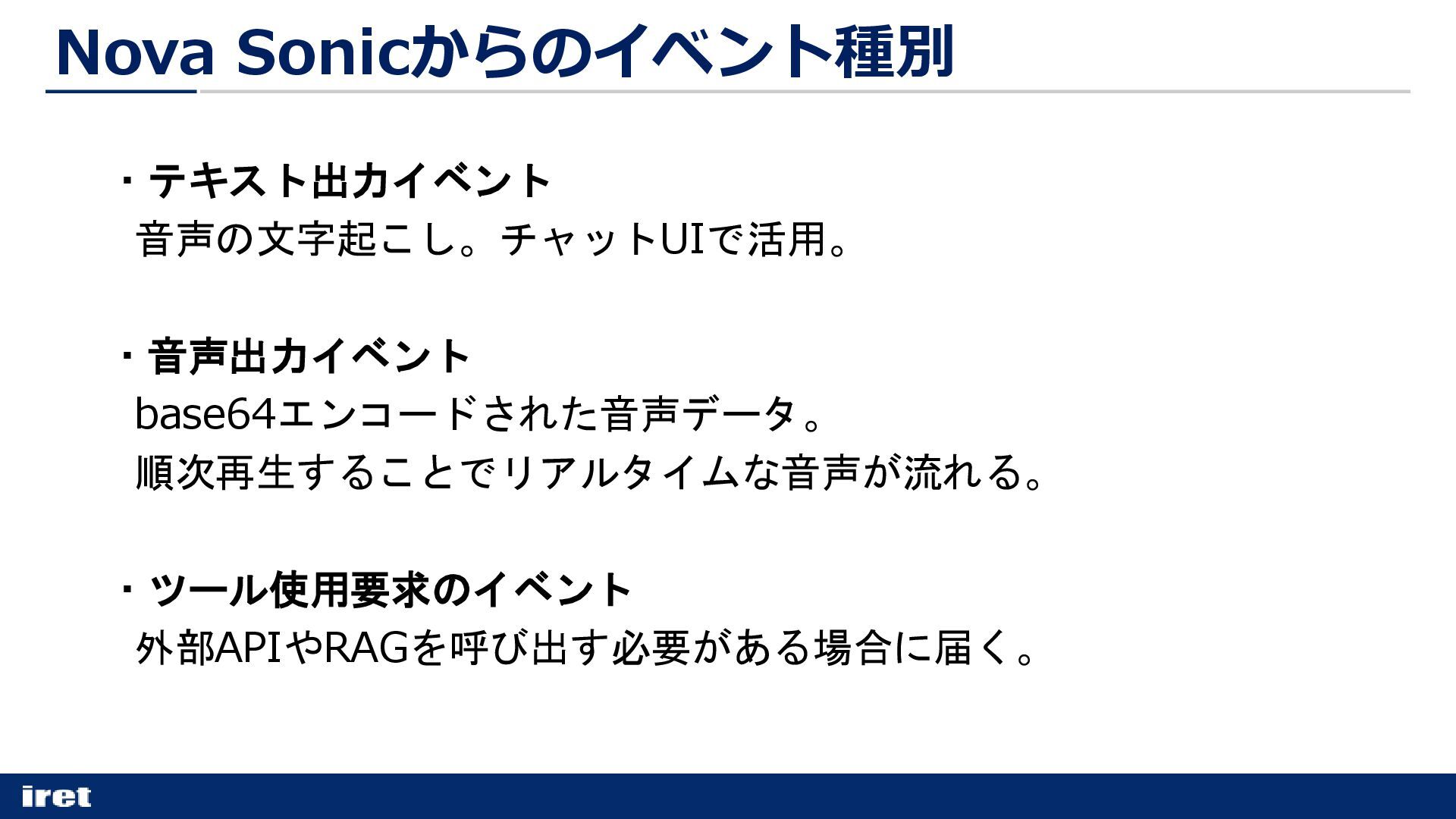 ・テキスト出力イベント 音声の文字起こし。チャットUIで活用。 ・音声出力イベント base64エンコードされた音声データ。 順次再生することでリアルタイムな音声が流れる。 ・ツール使用要求のイベント 外部APIやRAGを呼び出す必要がある場合に届く。 Nova Sonicからのイベント種別