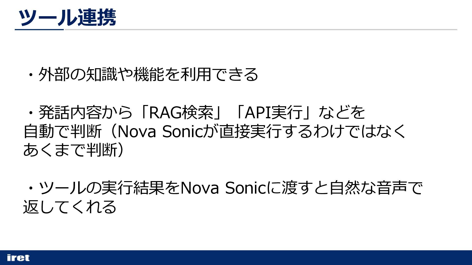 ・外部の知識や機能を利用できる ・発話内容から「RAG検索」「API実行」などを 自動で判断(Nova Sonicが直接実行するわけではなく あくまで判断) ・ツールの実行結果をNova Sonicに渡すと自然な音声で 返してくれる ツール連携