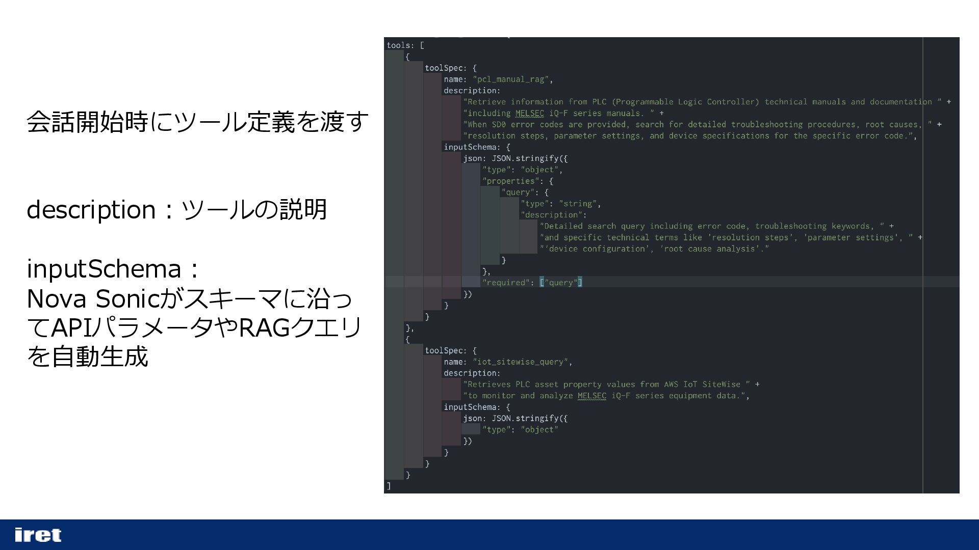 会話開始時にツール定義を渡す description:ツールの説明 inputSchema: Nova Sonicがスキーマに沿っ てAPIパラメータやRAGクエリ を自動生成