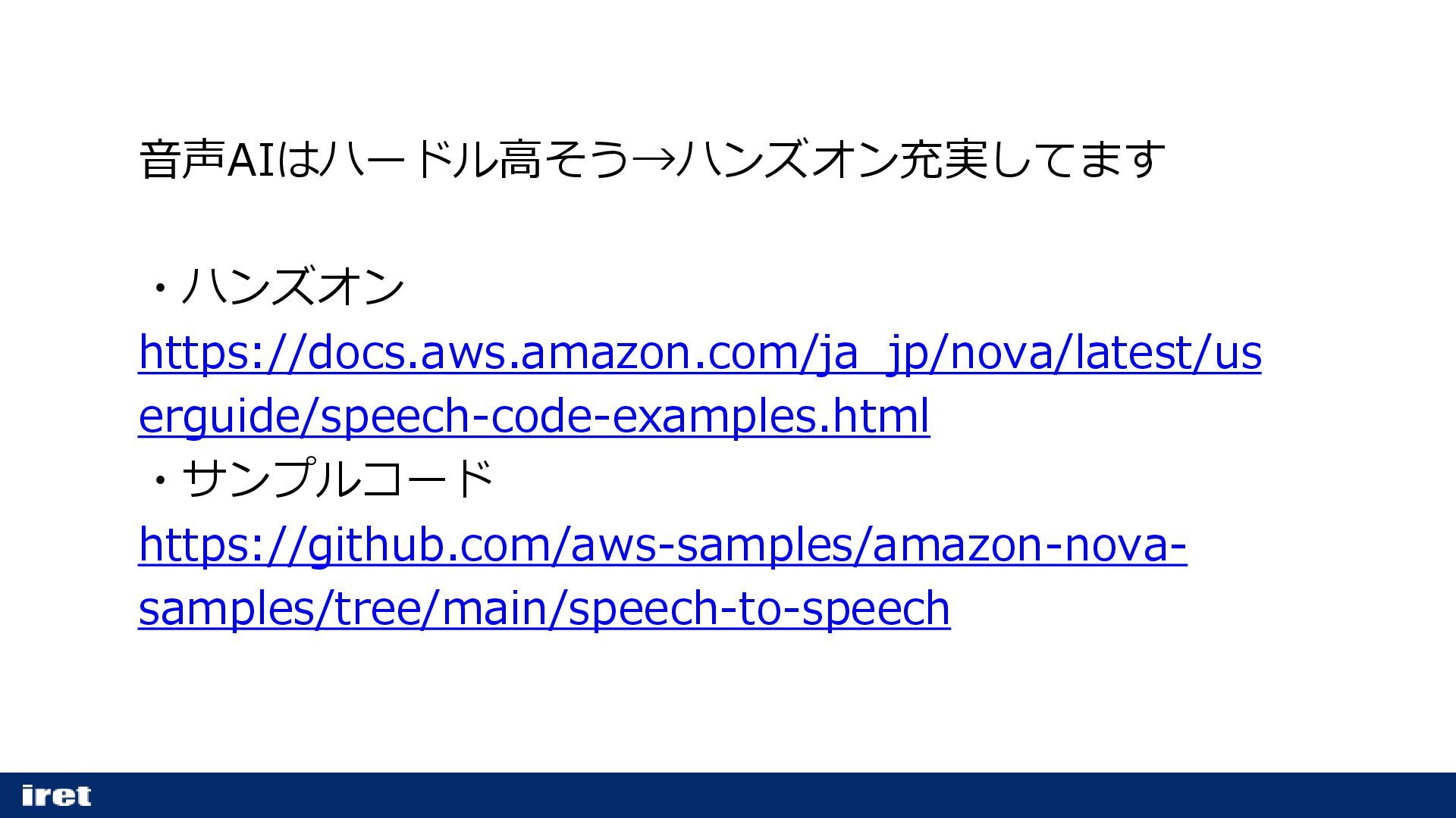 音声AIはハードル高そう→ハンズオン充実してます ・ハンズオン https://docs.aws.amazon.com/ja_jp/nova/latest/us erguide/speech-code-examples.html ・サンプルコード https://github.com/aws-samples/amazon-nova- samples/tree/main/speech-to-speech