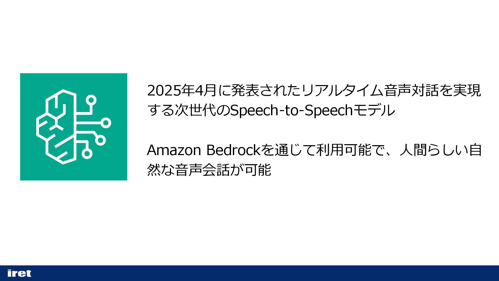 2025年4月に発表されたリアルタイム音声対話を実現 する次世代のSpeech-to-Speechモデル Amazon Bedrockを通じて利用可能で、人間らしい自 然な音声会話が可能