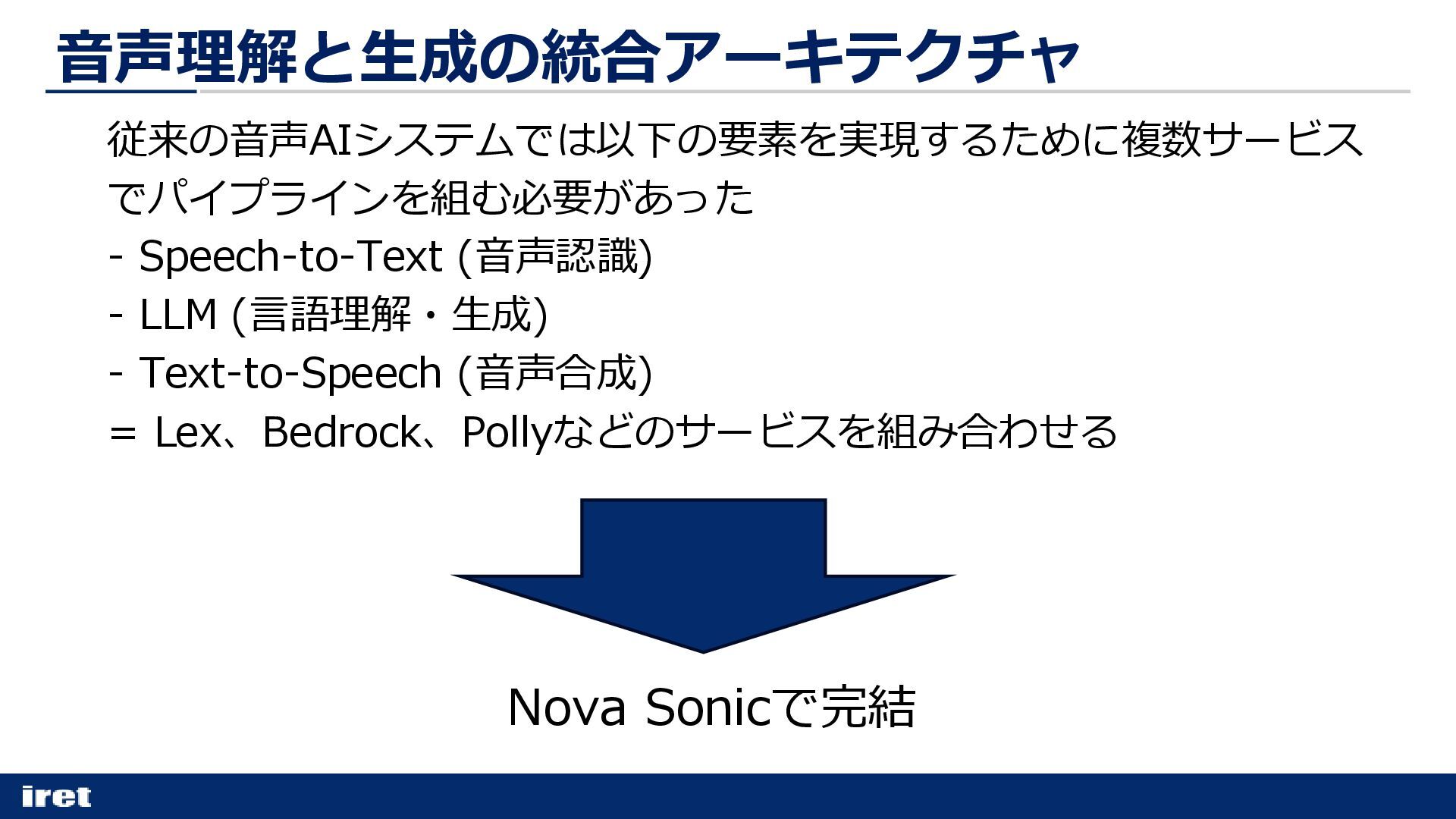 (音声合成) = Lex、Bedrock、Pollyなどのサービスを組み合わせる Nova Sonicで完結 音声理解と生成の統合アーキテクチャ