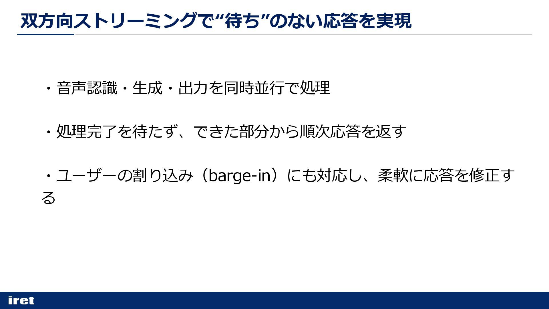・音声認識・生成・出力を同時並行で処理 ・処理完了を待たず、できた部分から順次応答を返す ・ユーザーの割り込み(barge-in)にも対応し、柔軟に応答を修正す る 双方向ストリーミングで“待ち”のない応答を実現