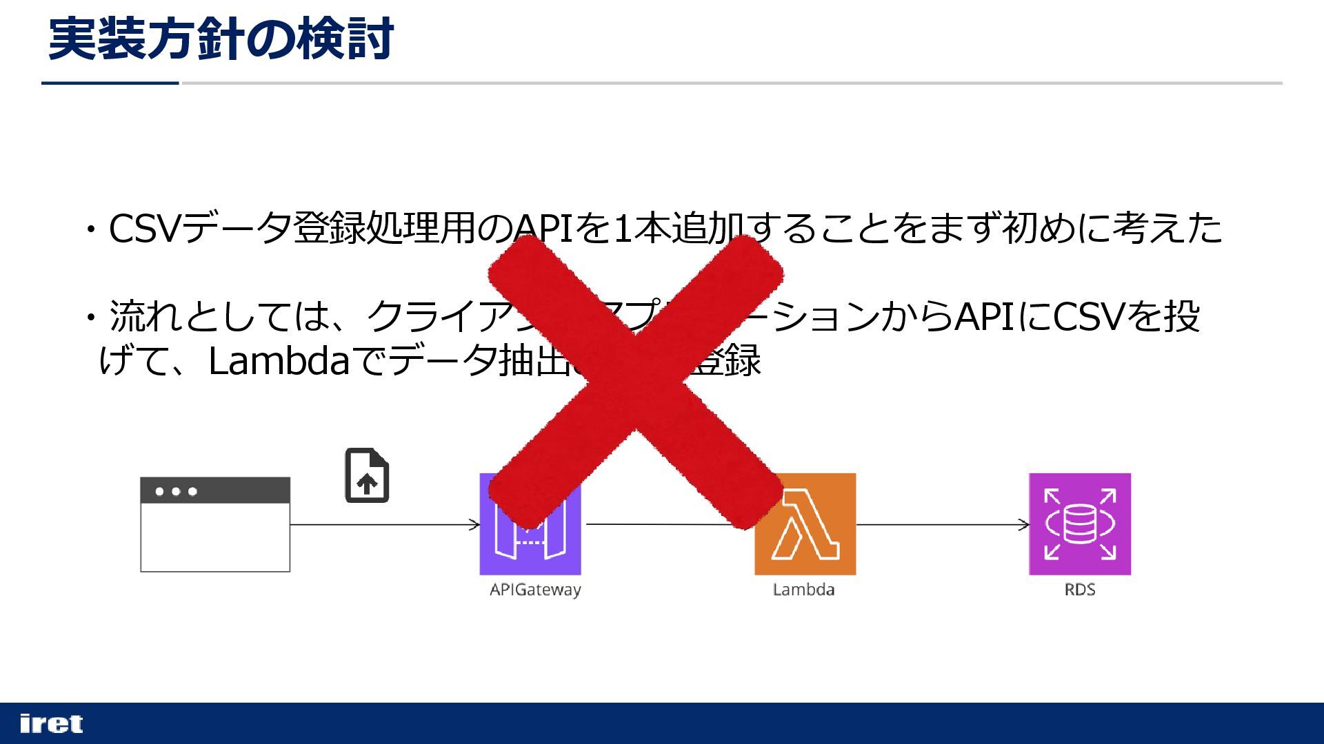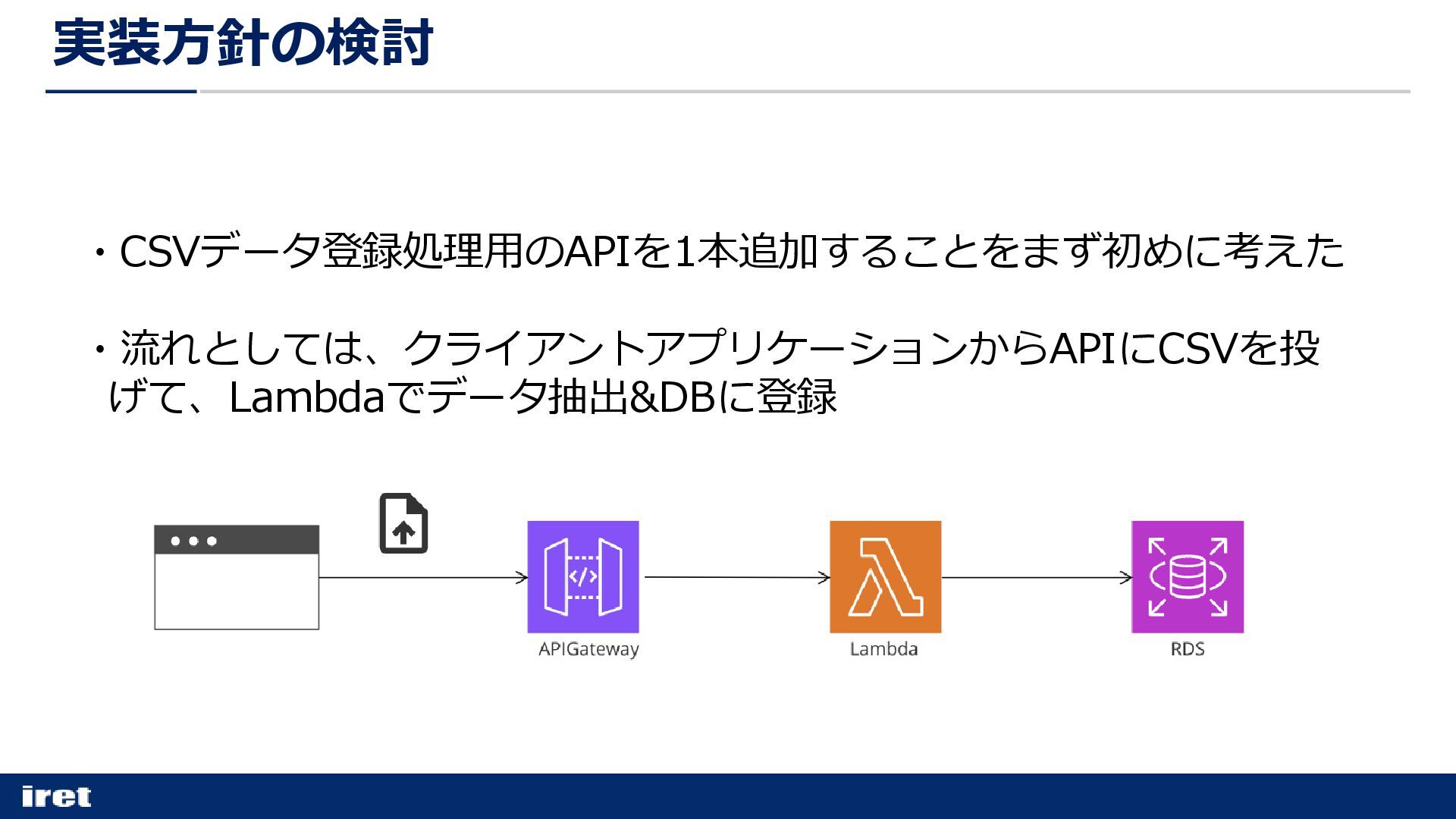 ・CSVデータ登録処理用のAPIを1本追加することをまず初めに考えた ・流れとしては、クライアントアプリケーションからAPIにCSVを投 げて、Lambdaでデータ抽出&DBに登録 実装方針の検討