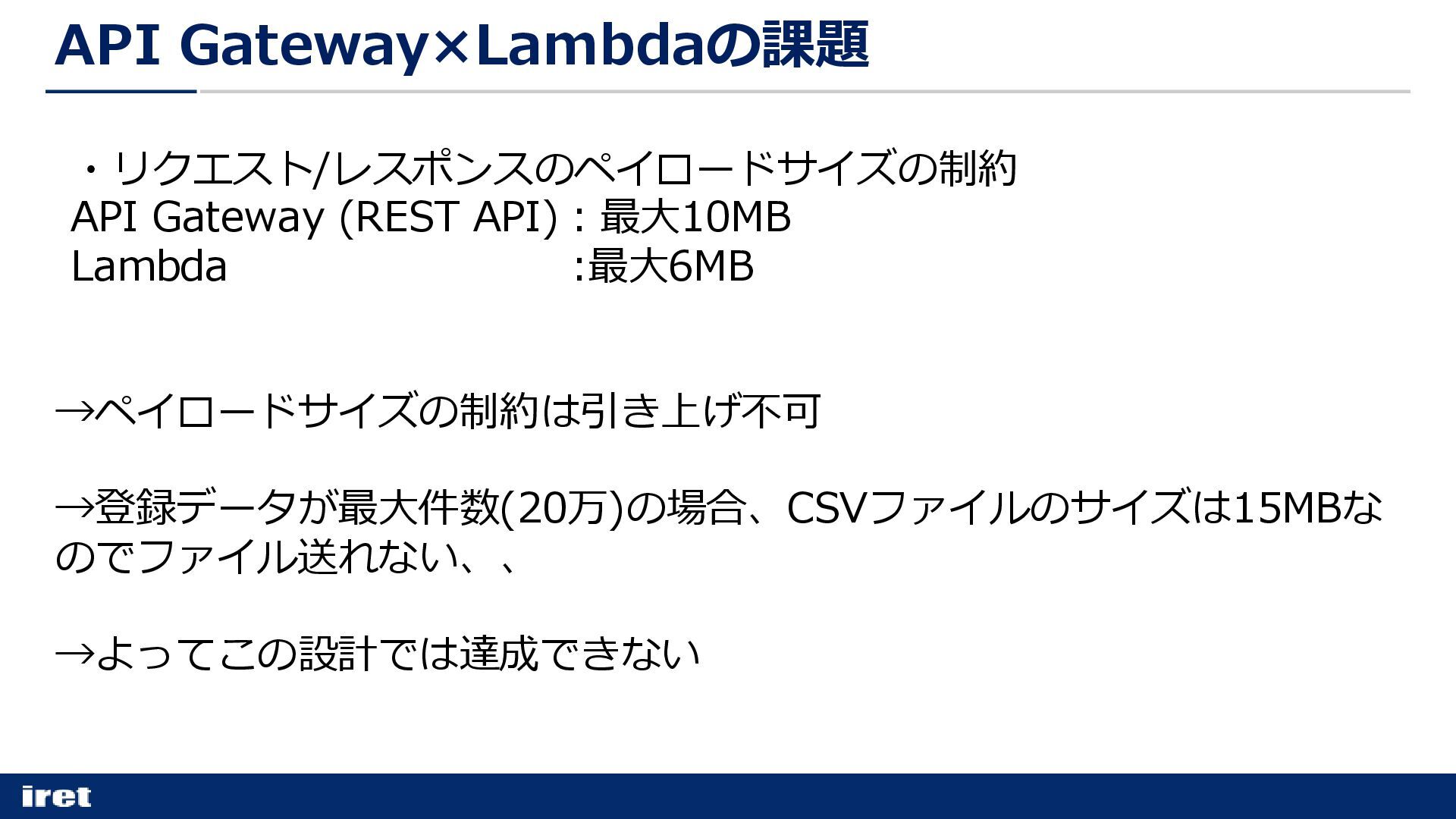 ・リクエスト/レスポンスのペイロードサイズの制約 API Gateway (REST API):最大10MB Lambda :最大6MB →ペイロードサイズの制約は引き上げ不可 →登録データが最大件数(20万)の場合、CSVファイルのサイズは15MBな のでファイル送れない、、