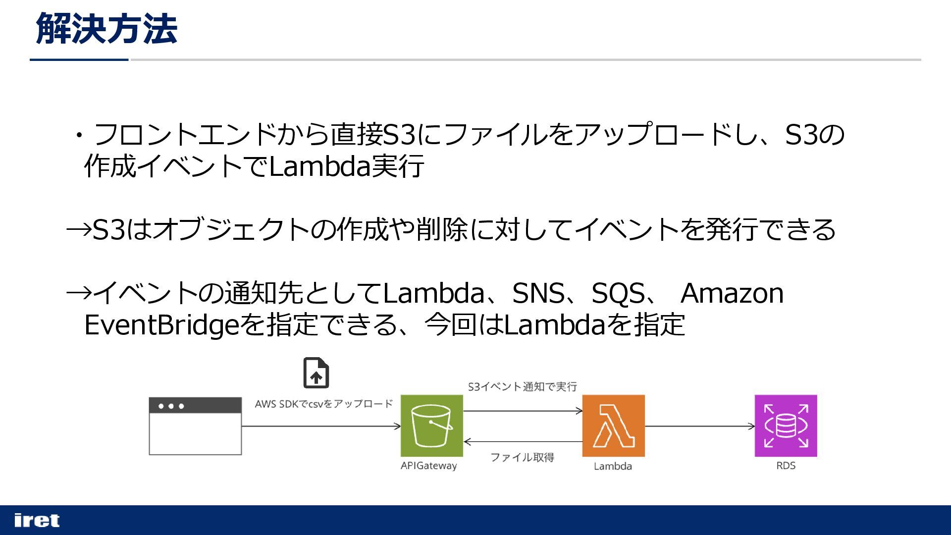 ・フロントエンドから直接S3にファイルをアップロードし、S3の 作成イベントでLambda実行 →S3はオブジェクトの作成や削除に対してイベントを発行できる →イベントの通知先としてLambda、SNS、SQS、 Amazon EventBridgeを指定できる、今回はLambdaを指定 解決方法