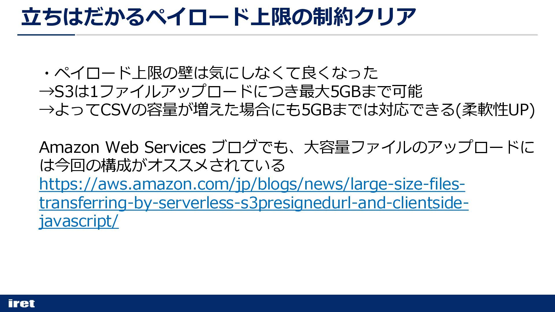 ・ペイロード上限の壁は気にしなくて良くなった →S3は1ファイルアップロードにつき最大5GBまで可能 →よってCSVの容量が増えた場合にも5GBまでは対応できる(柔軟性UP) Amazon Web Services ブログでも、大容量ファイルのアップロードに は今回の構成がオススメされている https://aws.amazon.com/jp/blogs/news/large-size-files- transferring-by-serverless-s3presignedurl-and-clientside-