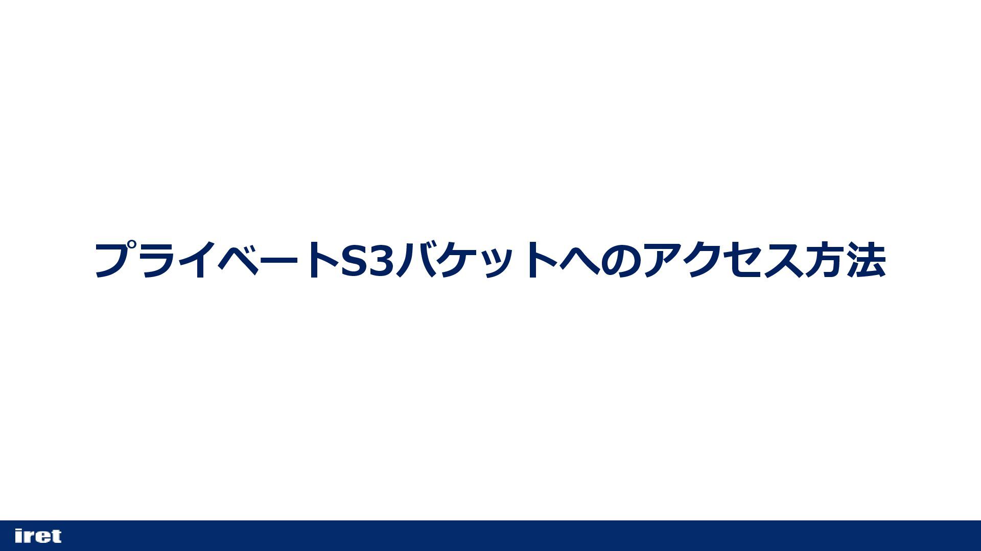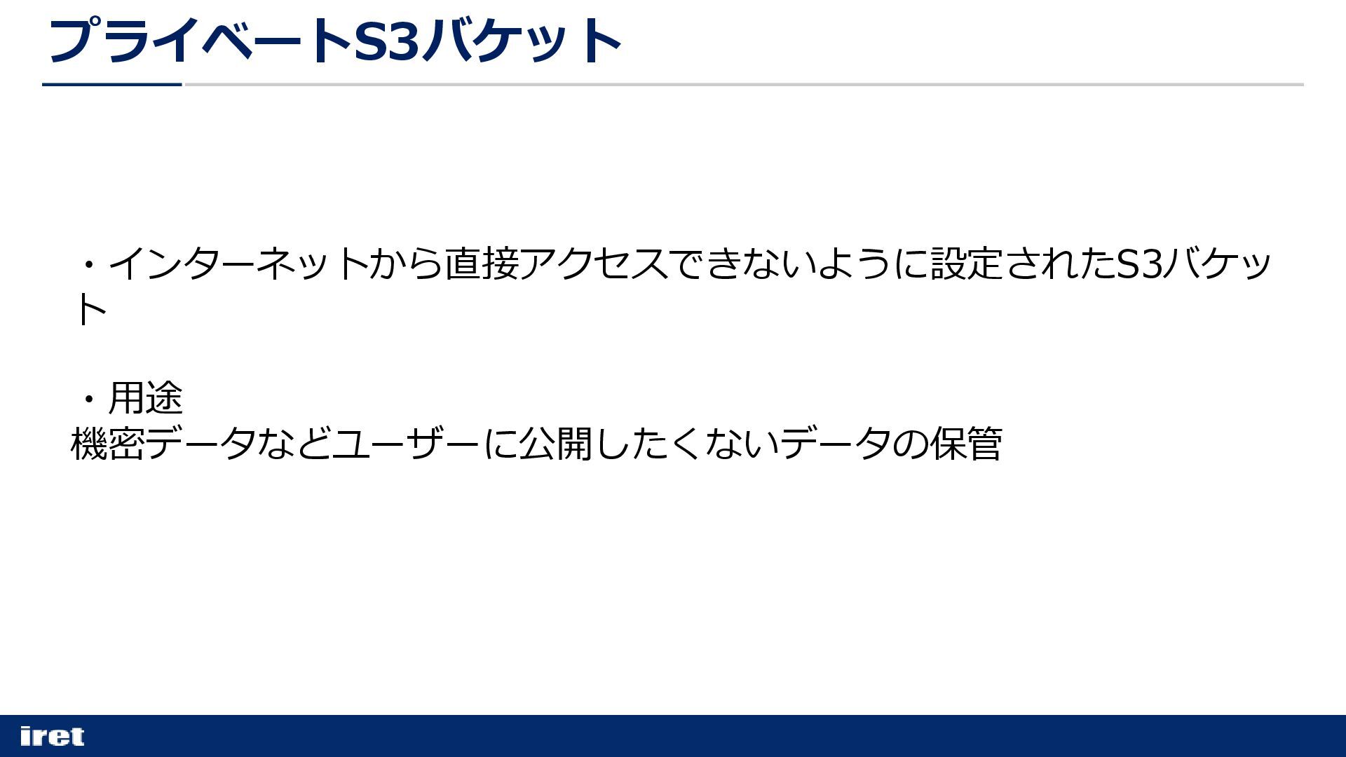 ・インターネットから直接アクセスできないように設定されたS3バケッ ト ・用途 機密データなどユーザーに公開したくないデータの保管 プライベートS3バケット
