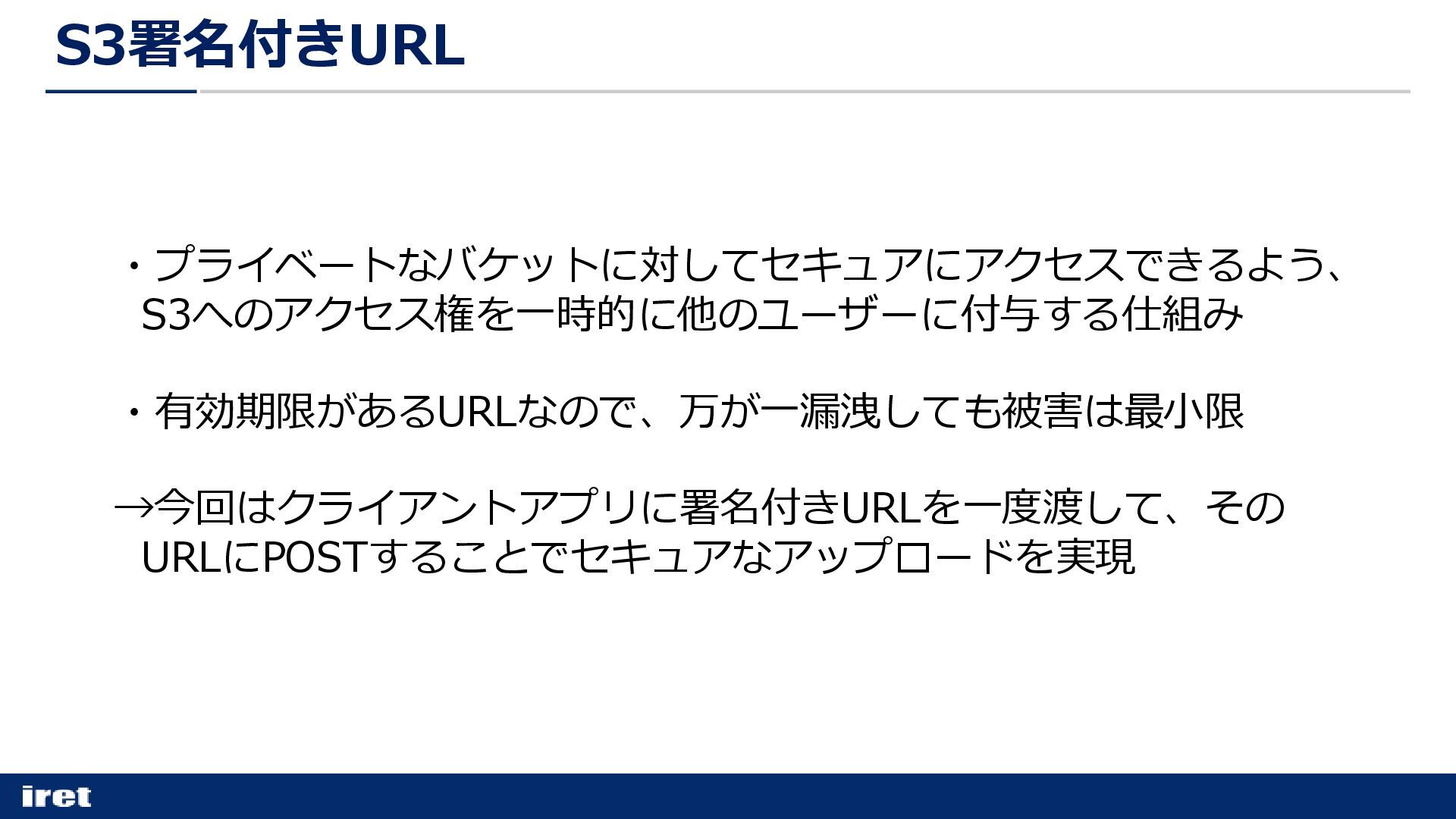 ・プライベートなバケットに対してセキュアにアクセスできるよう、 S3へのアクセス権を一時的に他のユーザーに付与する仕組み ・有効期限があるURLなので、万が一漏洩しても被害は最小限 →今回はクライアントアプリに署名付きURLを一度渡して、その URLにPOSTすることでセキュアなアップロードを実現 S3署名付きURL