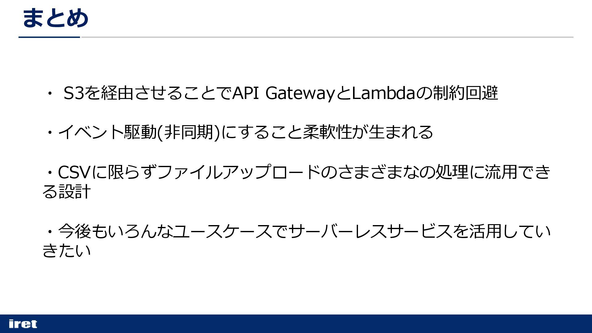 まとめ ・ S3を経由させることでAPI GatewayとLambdaの制約回避 ・イベント駆動(非同期)にすること柔軟性が生まれる ・CSVに限らずファイルアップロードのさまざまなの処理に流用でき る設計 ・今後もいろんなユースケースでサーバーレスサービスを活用してい きたい