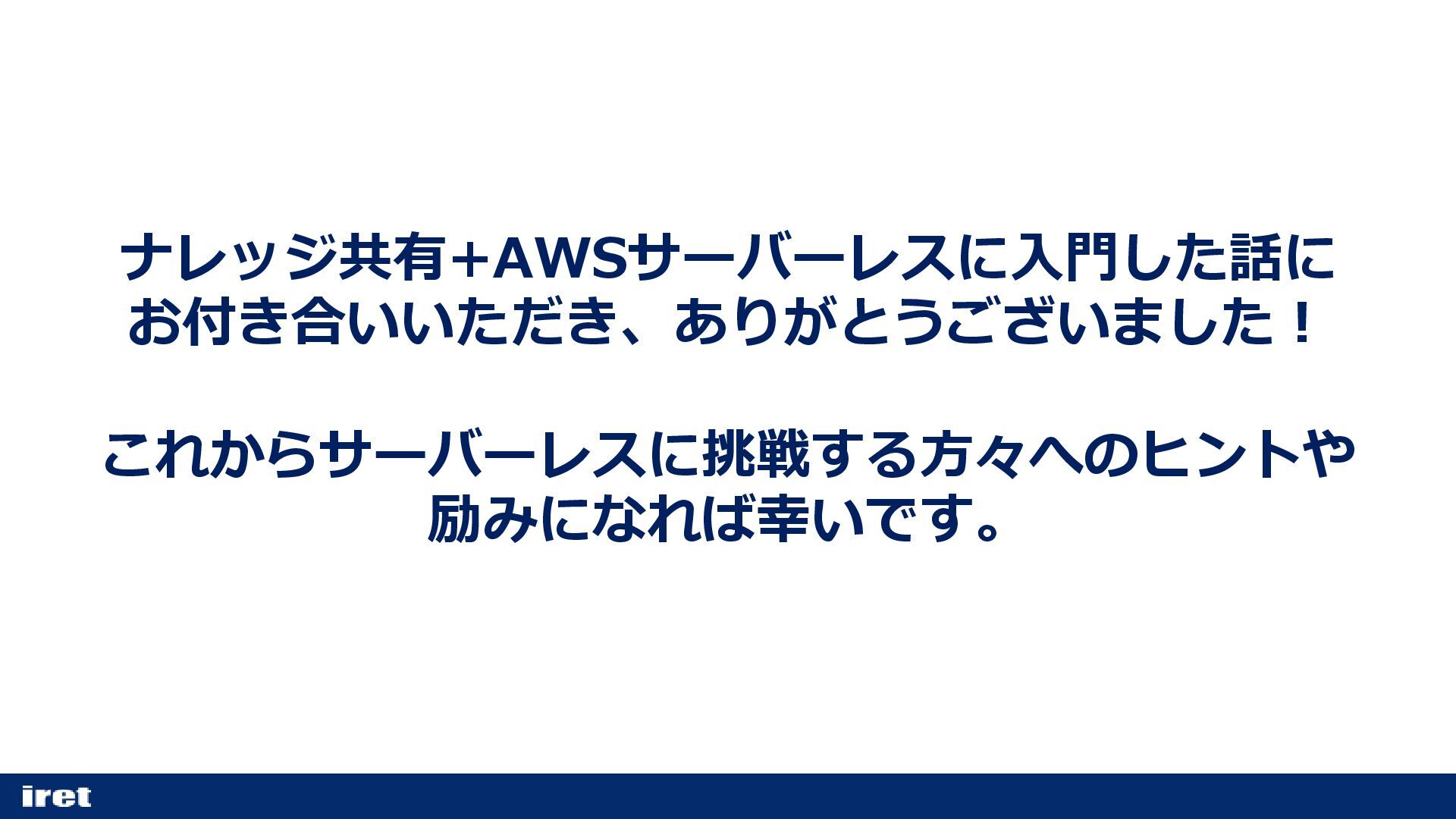 ナレッジ共有+AWSサーバーレスに入門した話に お付き合いいただき、ありがとうございました! これからサーバーレスに挑戦する方々へのヒントや 励みになれば幸いです。