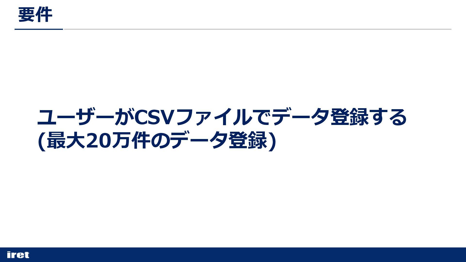 ユーザーがCSVファイルでデータ登録する (最大20万件のデータ登録) 要件