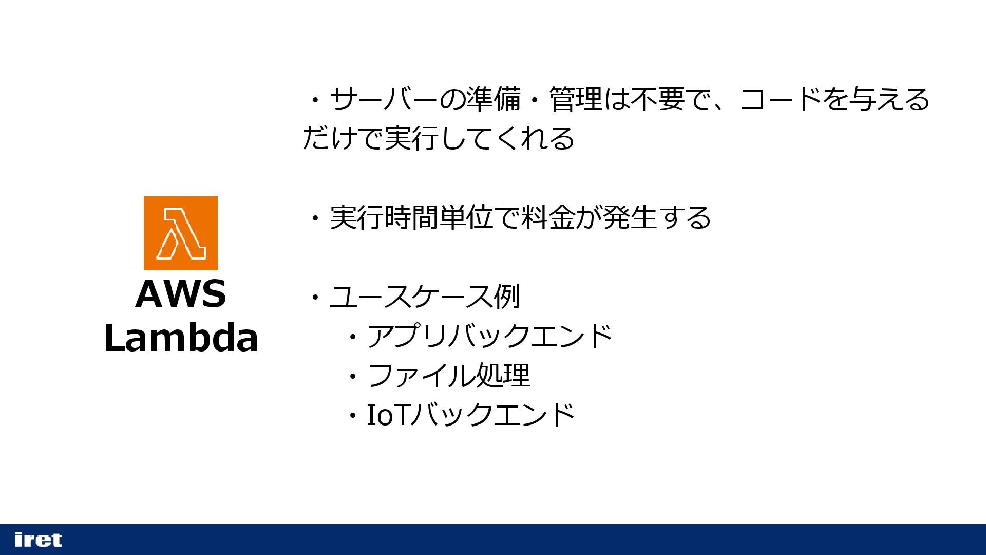 AWS Lambda ・サーバーの準備・管理は不要で、コードを与える だけで実行してくれる ・実行時間単位で料金が発生する ・ユースケース例 ・アプリバックエンド ・ファイル処理 ・IoTバックエンド