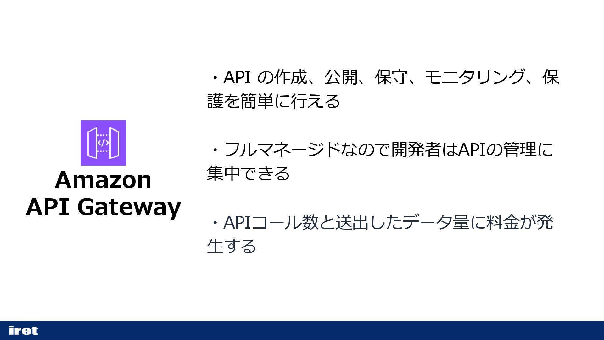 Amazon API Gateway ・API の作成、公開、保守、モニタリング、保 護を簡単に行える ・フルマネージドなので開発者はAPIの管理に 集中できる ・APIコール数と送出したデータ量に料金が発 生する