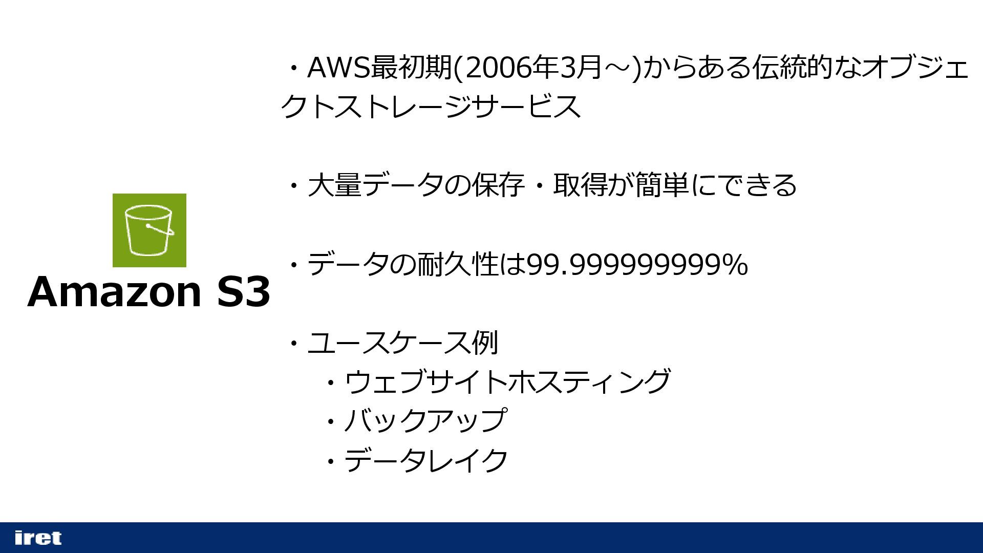 Amazon S3 ・AWS最初期(2006年3月〜)からある伝統的なオブジェ クトストレージサービス ・大量データの保存・取得が簡単にできる ・データの耐久性は99.999999999% ・ユースケース例 ・ウェブサイトホスティング ・バックアップ ・データレイク