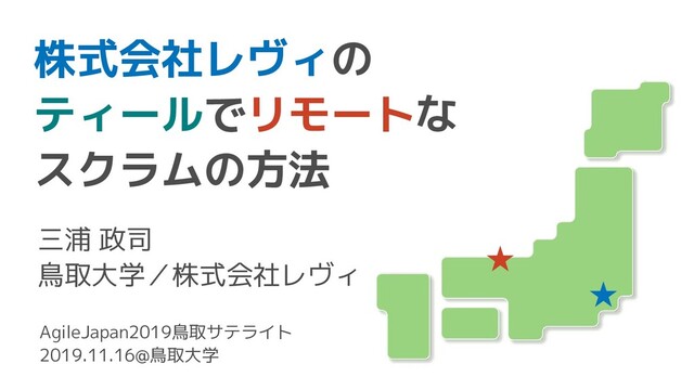 株式会社レヴィの ティールでリモートな スクラムの方法 三浦 政司 鳥取大学/株式会社レヴィ ★ ★ AgileJapan2019鳥取サテライト 2019.11.16@鳥取大学