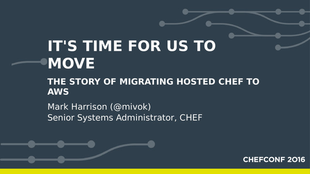 Hosted Chef is one of the biggest Chef installations there is, with tens of thousands of organizations managing hundreds of thousands of Chef clients. By 2015, Hosted Chef had been growing exponentially for several years, and it was quickly outgrowing its home. It was time for a change, and so last October we migrated Hosted Chef from its original data center into AWS. As if the migration of a large production service wasn't enough, we were using an aging code base with practices and procedures that were years old, with references to CouchDB and workarounds from Chef 0.9! It was time to modernize all of our cookbooks, start using modern features, and generally rewrite everything at the same time. This talk is the story of that migration, the decisions we made, the challenges we faced, and the spectacular results. I'll cover what worked and what didn't go so well, and along the way I'll share some critical insights that will be useful to anyone running a large Chef installation in a cloud environment such as AWS.