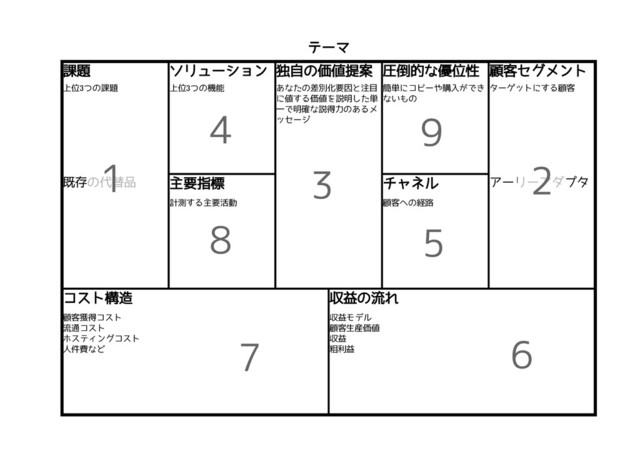 テーマ 課題 ソリューション 独自の価値提案 圧倒的な優位性 顧客セグメント 既存の代替品 主要指標 チャネル コスト構造