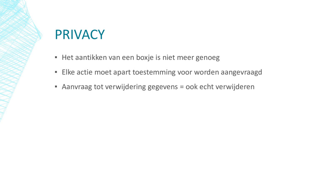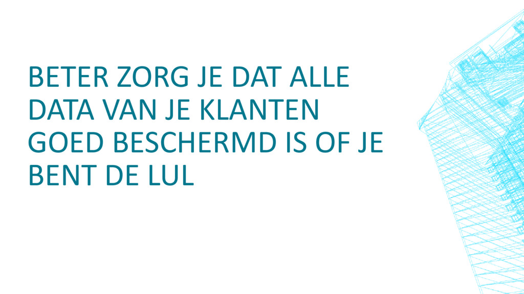 ▪ Jij bent verantwoordelijk voor de data van je klanten ▪ Derde partij moet dus voldoen aan de Eisen van de GDPR, ook als ze buiten Europa zitten ▪ Ga dus altijd na of ze voldoen aan de eisen door bijvoorbeeld een belletje te plegen