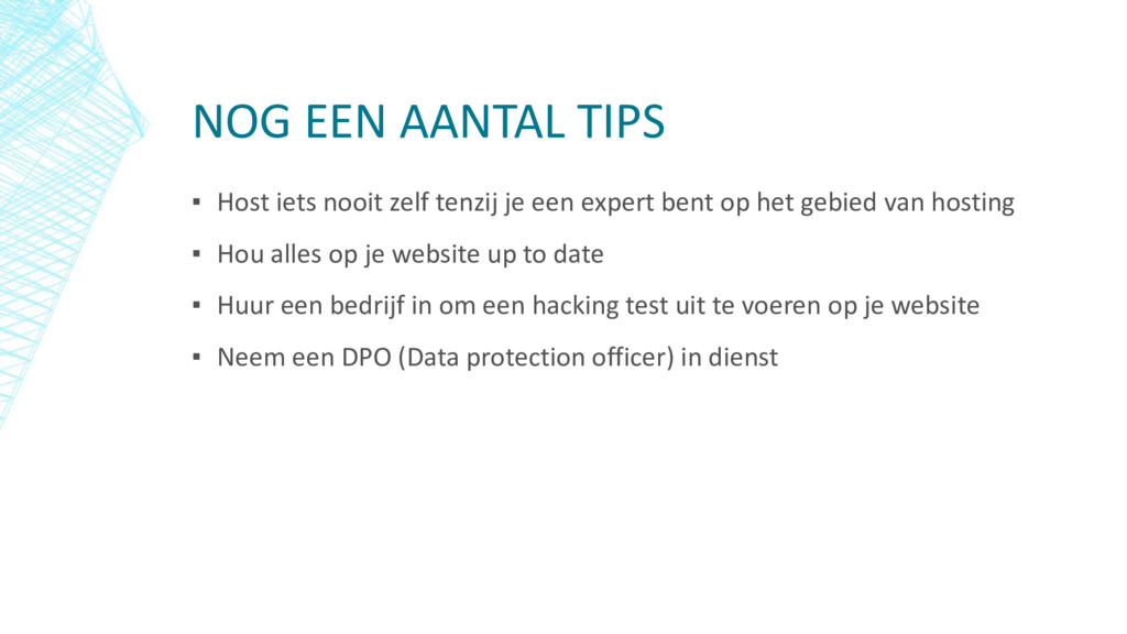 je een expert bent op het gebied van hosting ▪ Hou alles op je website up to date ▪ Huur een bedrijf in om een hacking test uit te voeren op je website ▪ Neem een DPO (Data protection officer) in dienst