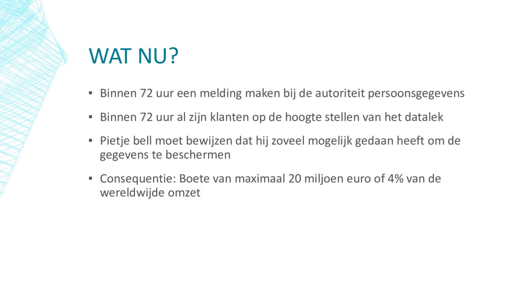 de autoriteit persoonsgegevens ▪ Binnen 72 uur al zijn klanten op de hoogte stellen van het datalek ▪ Pietje bell moet bewijzen dat hij zoveel mogelijk gedaan heeft om de gegevens te beschermen ▪ Consequentie: Boete van maximaal 20 miljoen euro of 4% van de wereldwijde omzet