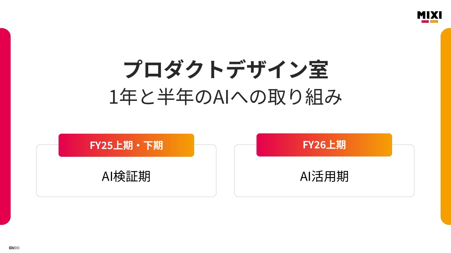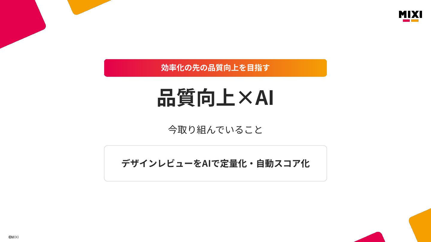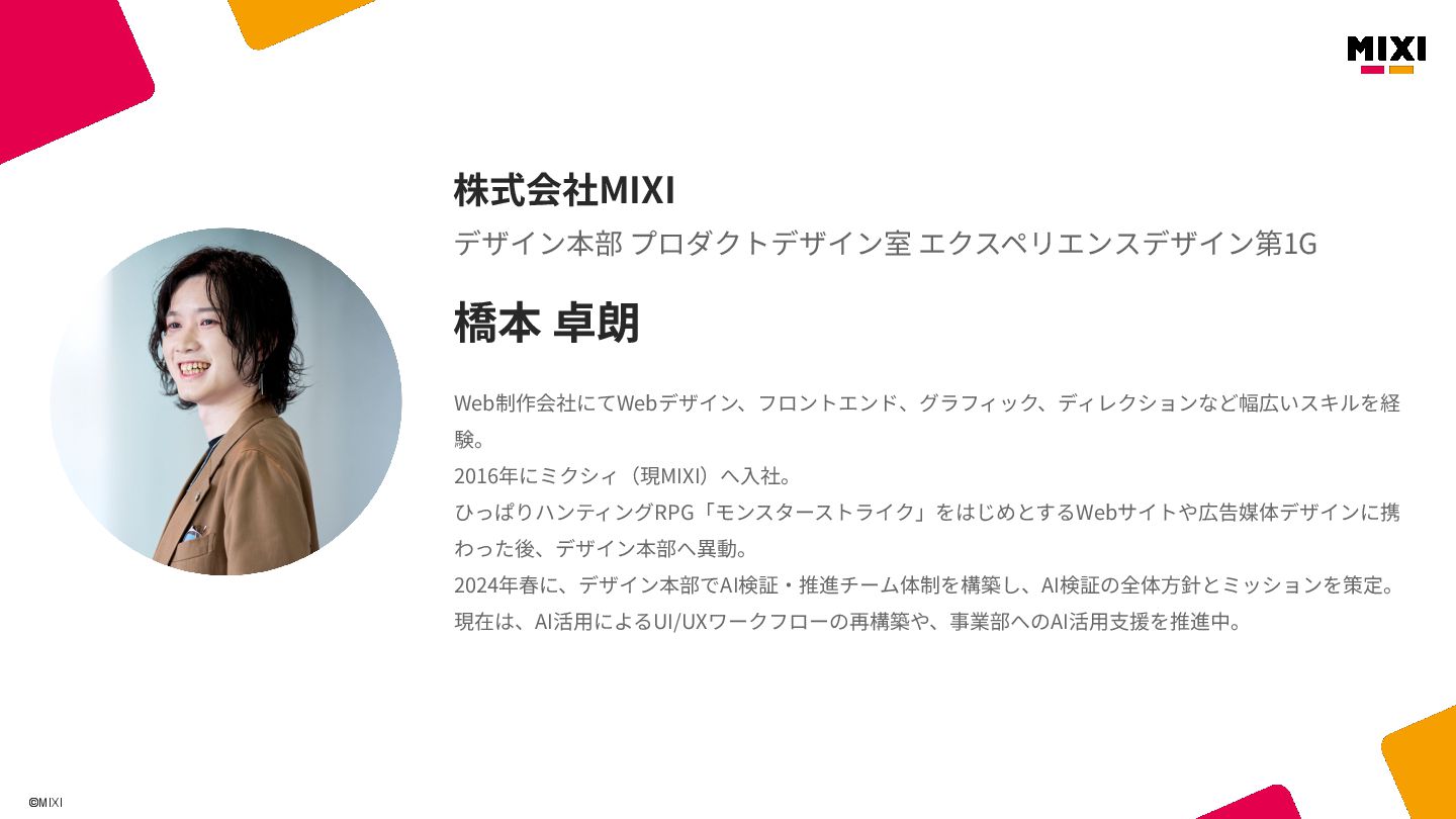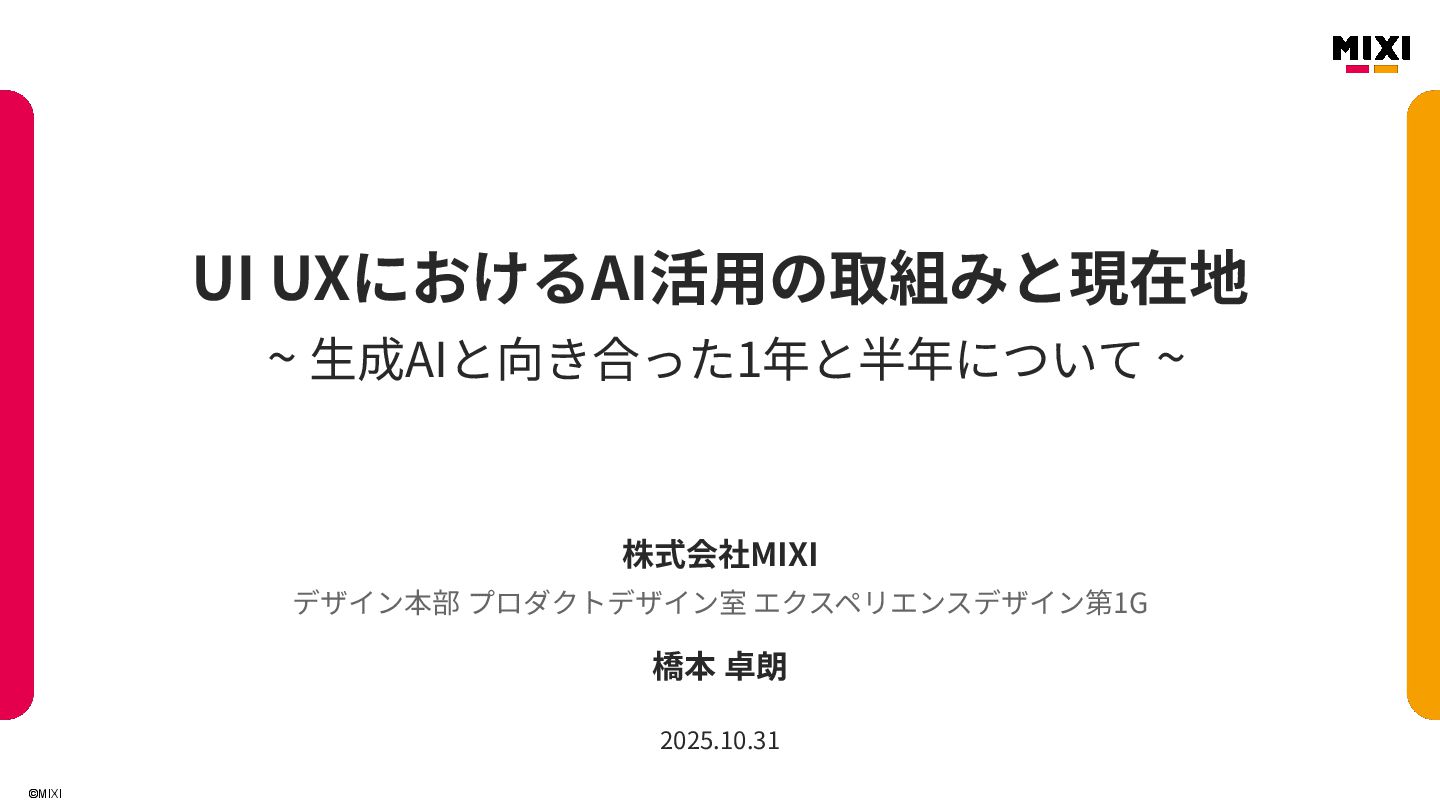 MIXIの横断デザイン組織であるデザイン本部のUI UXを司る部署が1年以上にわたり取り組んできたAI活用・検証の実践事例を起点に、AI活用の成功・失敗のリアルな現場の声を共有。