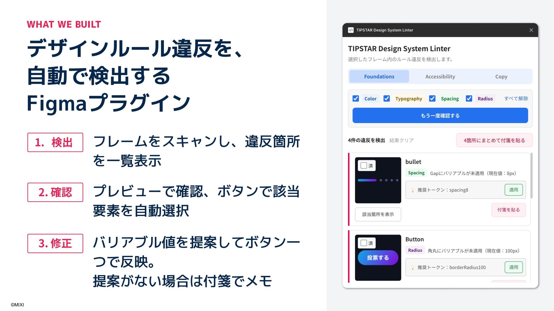MCPサーバー連携でデザイン実装 1 デザイン リクエスト 3 コード 生成 2 コンテキスト 返却 Figma Code ©MIXI