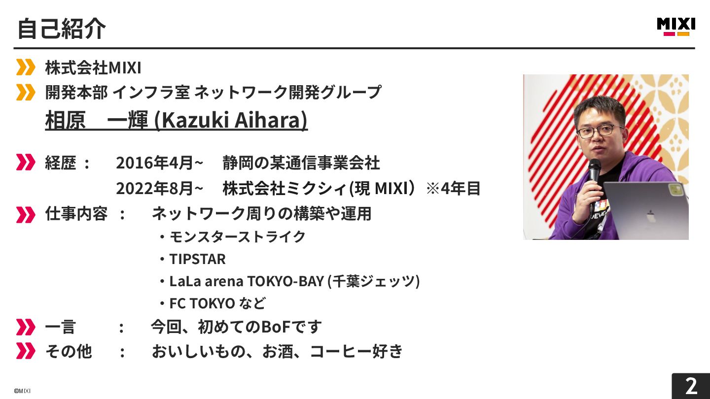 : 2016年4⽉~ 静岡の某通信事業会社 2022年8⽉~ 株式会社ミクシィ(現 MIXI)※4年⽬ 仕事内容 : ネットワーク周りの構築や運⽤         ‧モンスターストライク         ‧TIPSTAR         ‧LaLa arena TOKYO-BAY (千葉ジェッツ)         ‧FC TOKYO など ⼀⾔   :  今回、初めてのBoFです その他 : おいしいもの、お酒、コーヒー好き ⾃⼰紹介