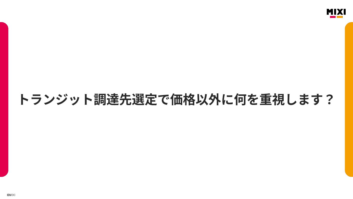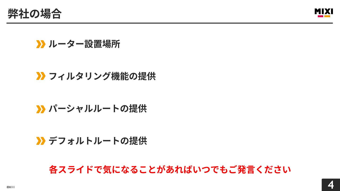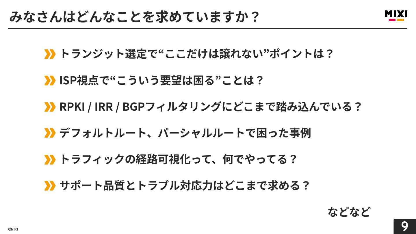 3. ©MIXI 9 みなさんはどんなことを求めていますか? トランジット選定で“ここだけは譲れない”ポイントは? ISP視点で“こういう要望は困る”ことは? RPKI / IRR / BGPフィルタリングにどこまで踏み込んでいる?