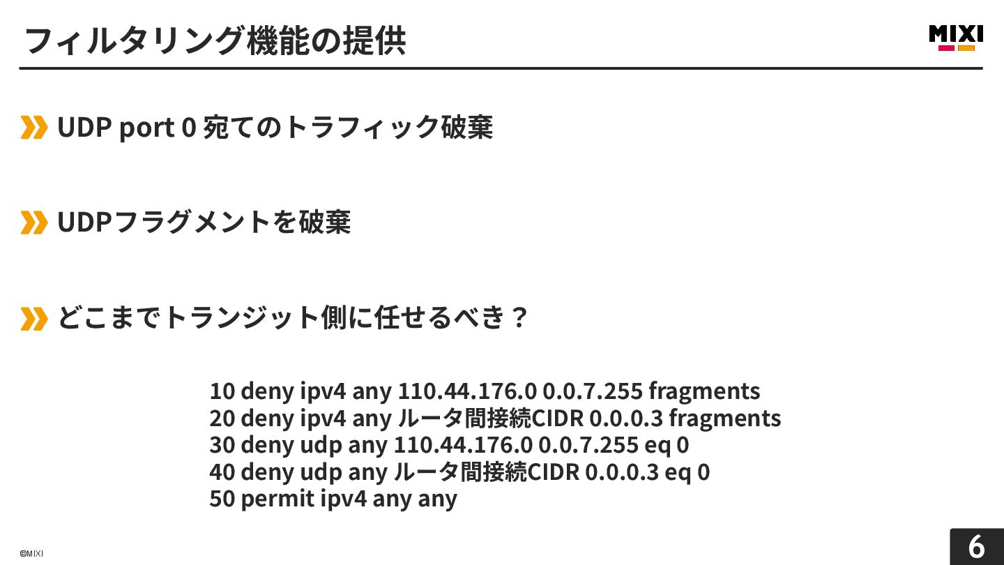 2. ©MIXI 6 フィルタリング機能の提供 UDP port 0 宛てのトラフィック破棄 UDPフラグメントを破棄 どこまでトランジット側に任せるべき? 10
