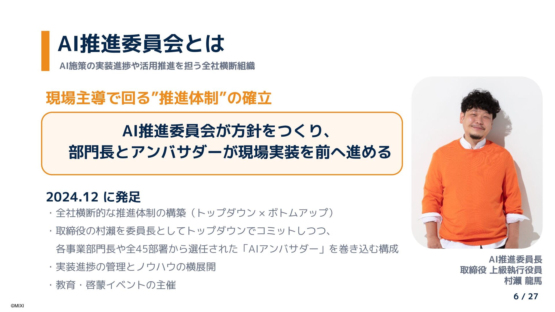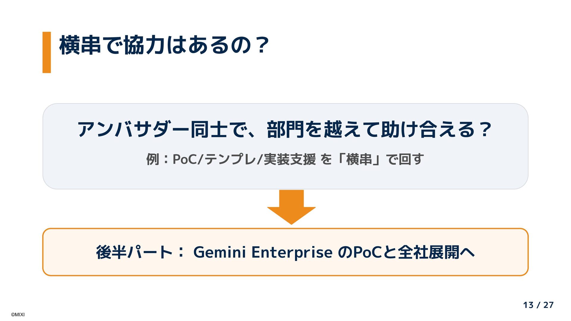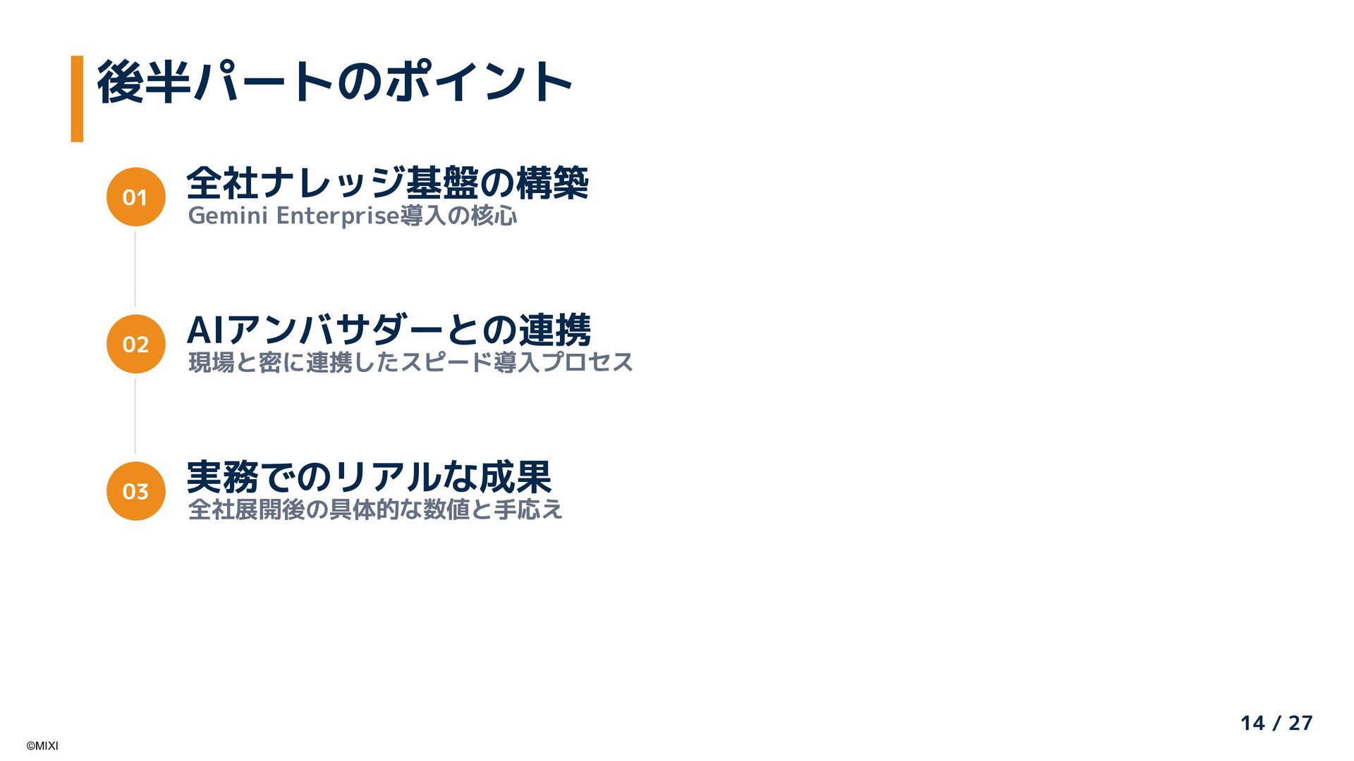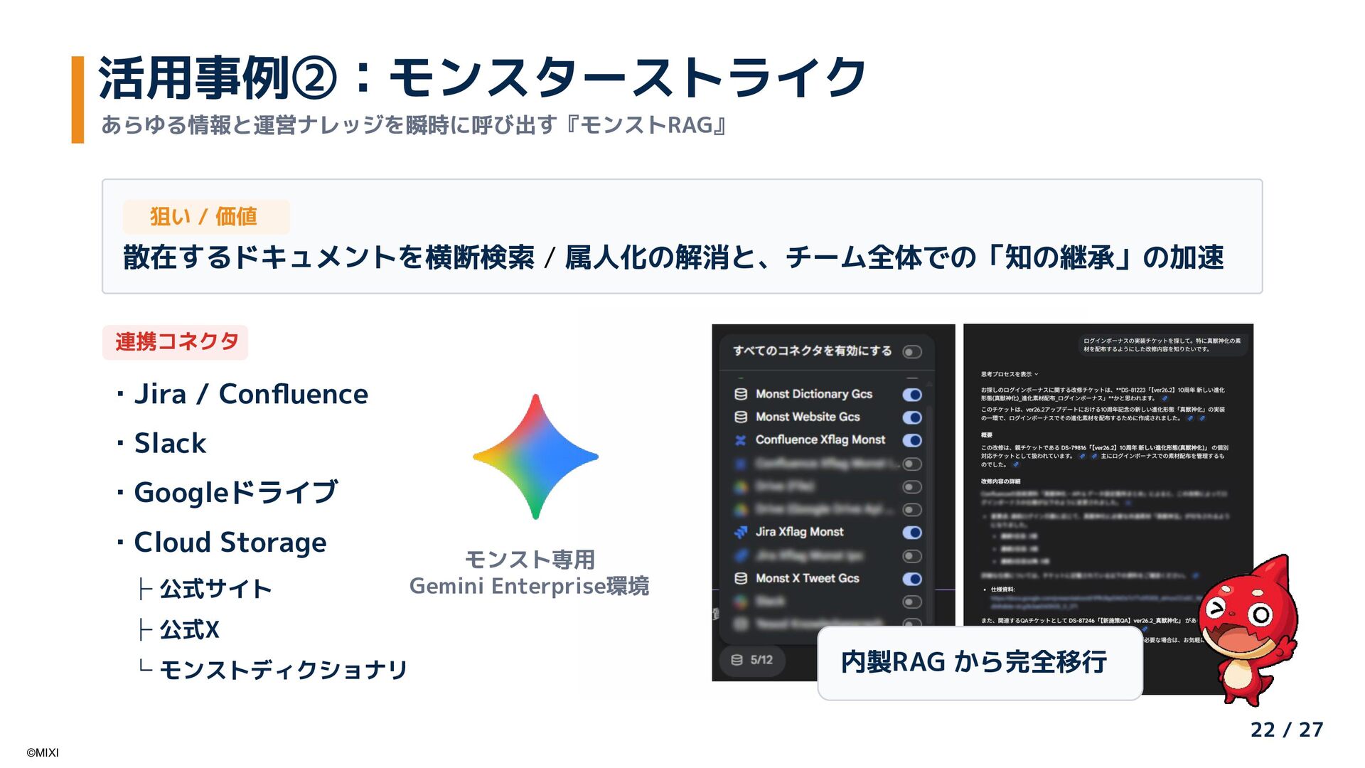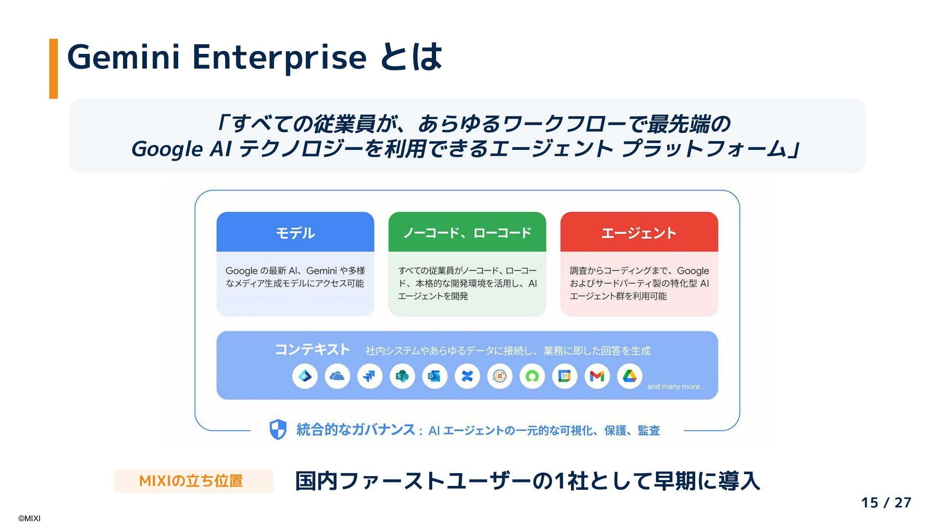 AI推進委員会・アンバサダー制度による全社AI活用推進と、Google Cloudの「Gemini Enterprise」を活用した大規模社内ナレッジの検索・活用基盤刷新の取り組みを紹介します。「組織的な普及活動」と「Gemini Enterpriseによる知識活用」を組み合わせ、現場から経営までを一気通貫で支える社内AI活用の全体像と、その成果について共有します。