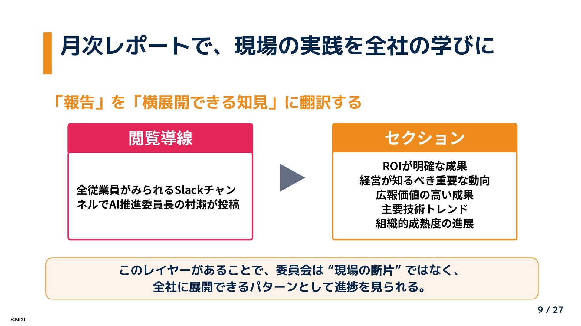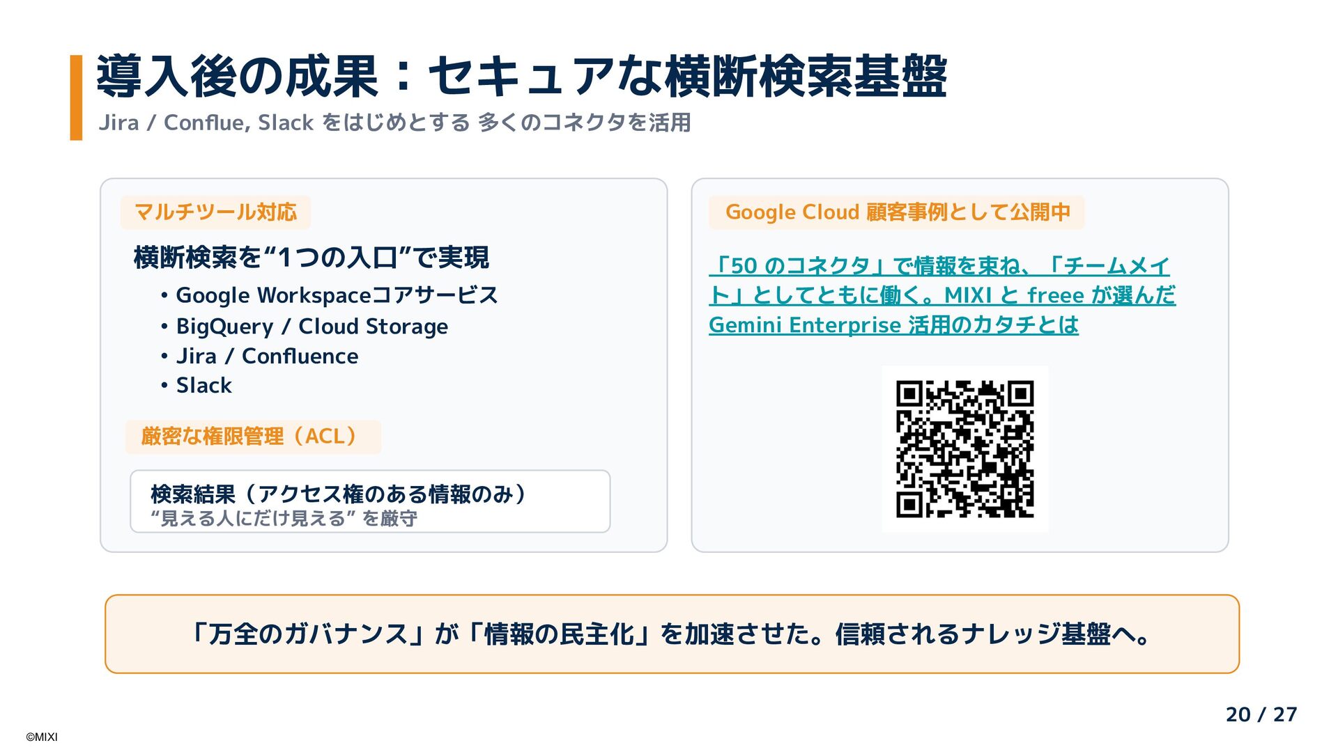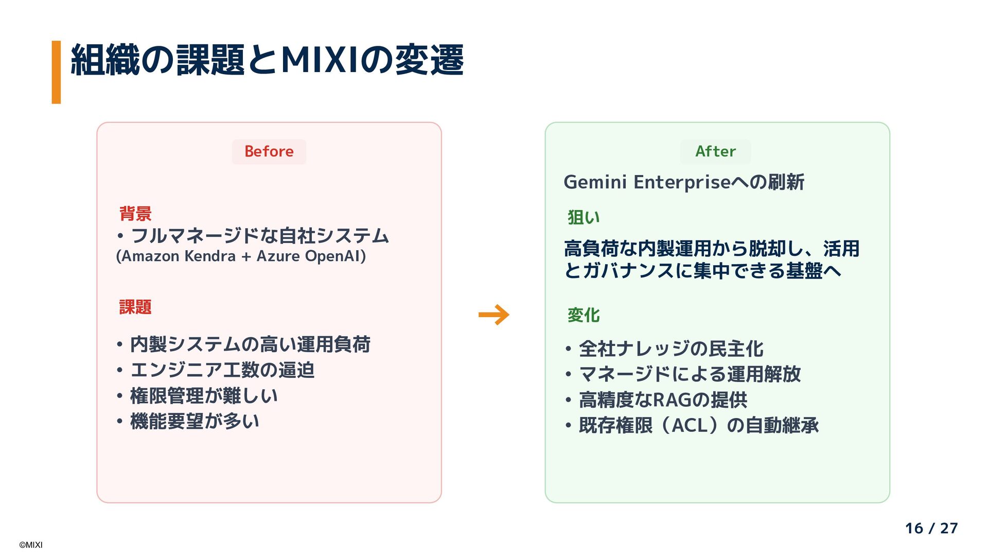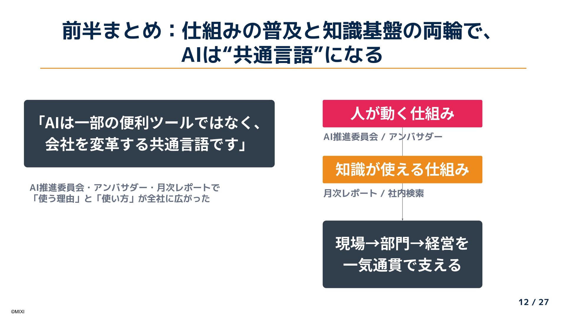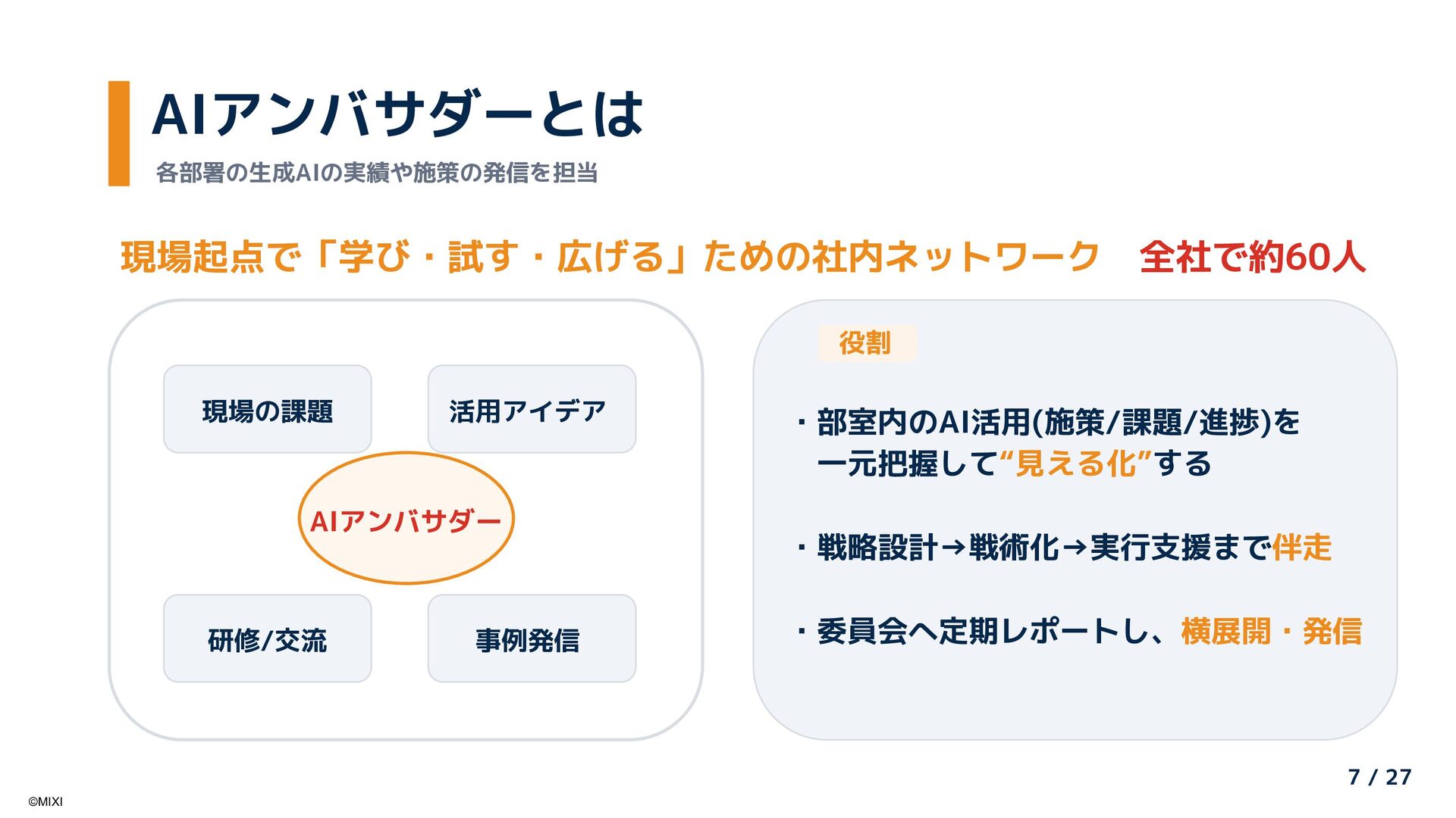 AI推進委員会・アンバサダー制度による全社AI活用推進と、Google Cloudの「Gemini Enterprise」を活用した大規模社内ナレッジの検索・活用基盤刷新の取り組みを紹介します。「組織的な普及活動」と「Gemini Enterpriseによる知識活用」を組み合わせ、現場から経営までを一気通貫で支える社内AI活用の全体像と、その成果について共有します。