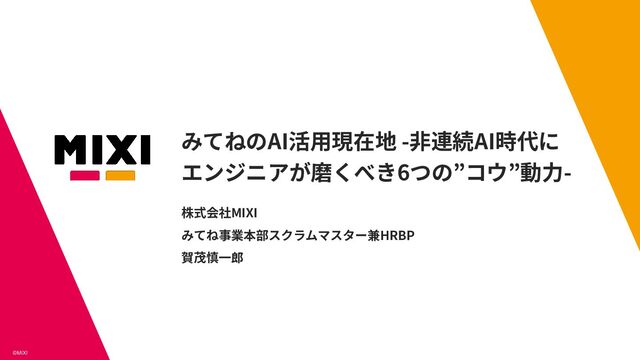 ©MIXI みてねのAI活⽤現在地 -⾮連続AI時代に エンジニアが磨くべき6つの”コウ”動⼒- 株式会社MIXI みてね事業本部スクラムマスター兼HRBP 賀茂慎⼀郎
