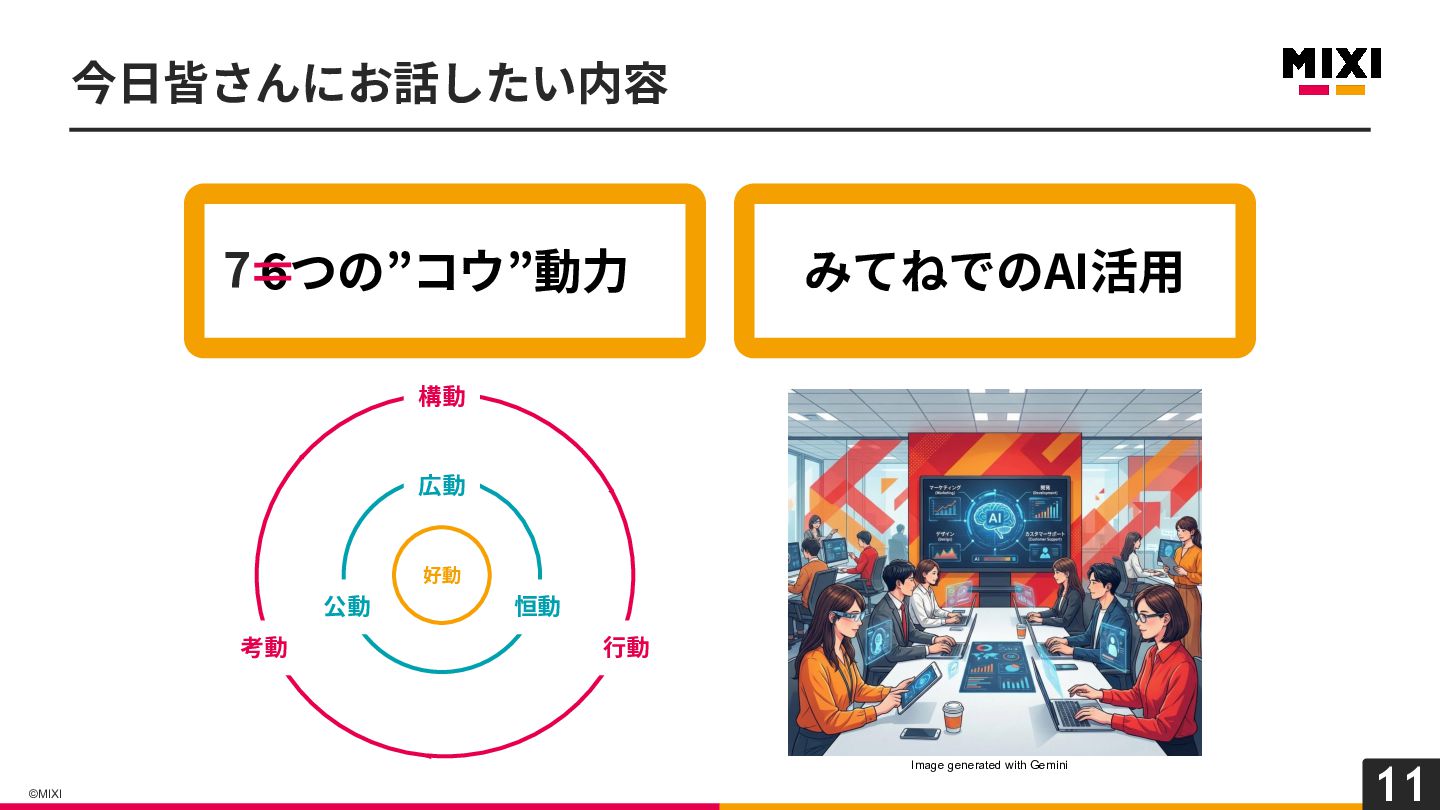 11 ©MIXI 今⽇皆さんにお話したい内容 みてねでのAI活⽤ 6つの”コウ”動⼒ 7 Image generated with Gemini