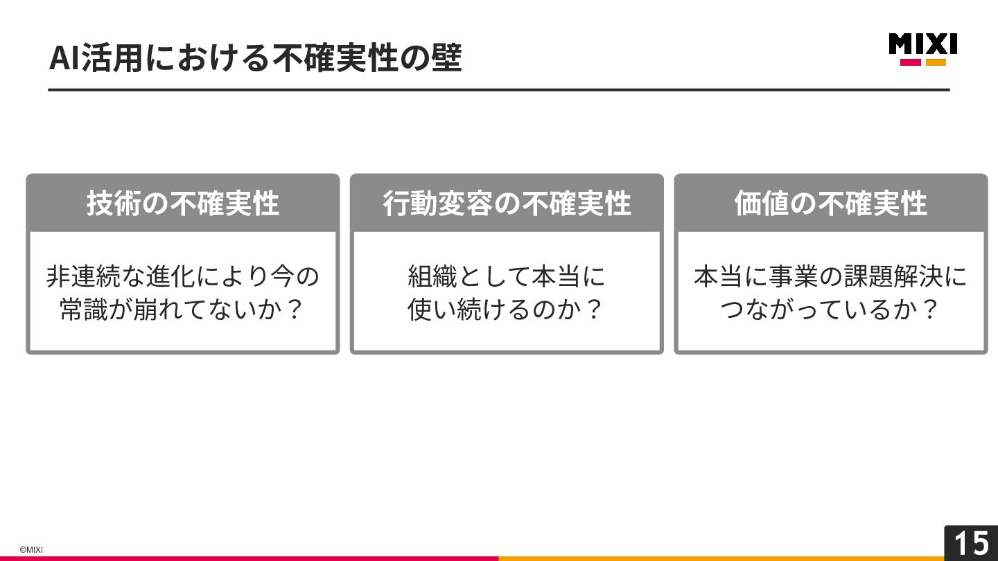 15 ©MIXI AI活⽤における不確実性の壁 ⾮連続な進化により今の 常識が崩れてないか? 技術の不確実性 本当に事業の課題解決に つながっているか? 価値の不確実性 組織として本当に