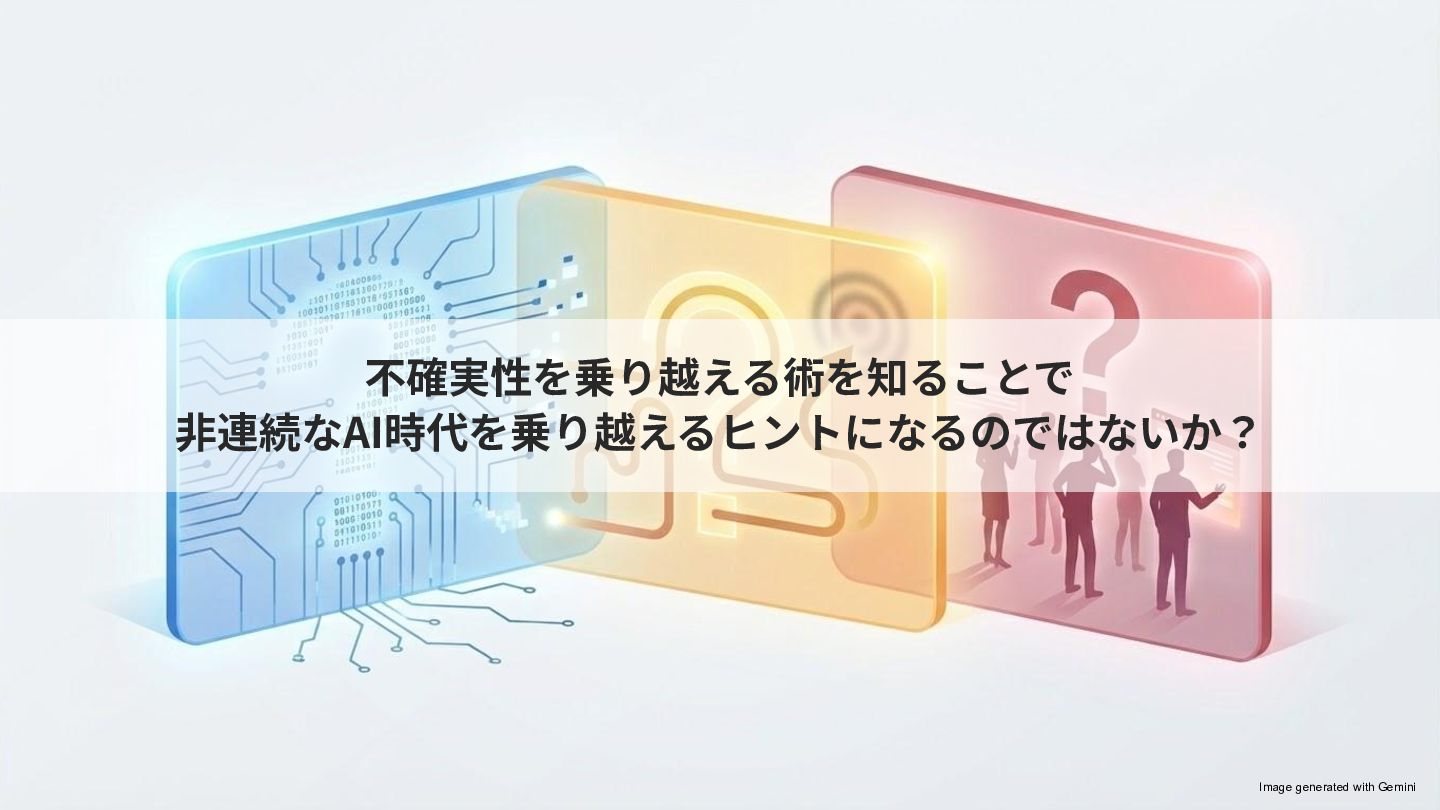 不確実性を乗り越える術を知ることで ⾮連続なAI時代を乗り越えるヒントになるのではないか? Image generated with Gemini