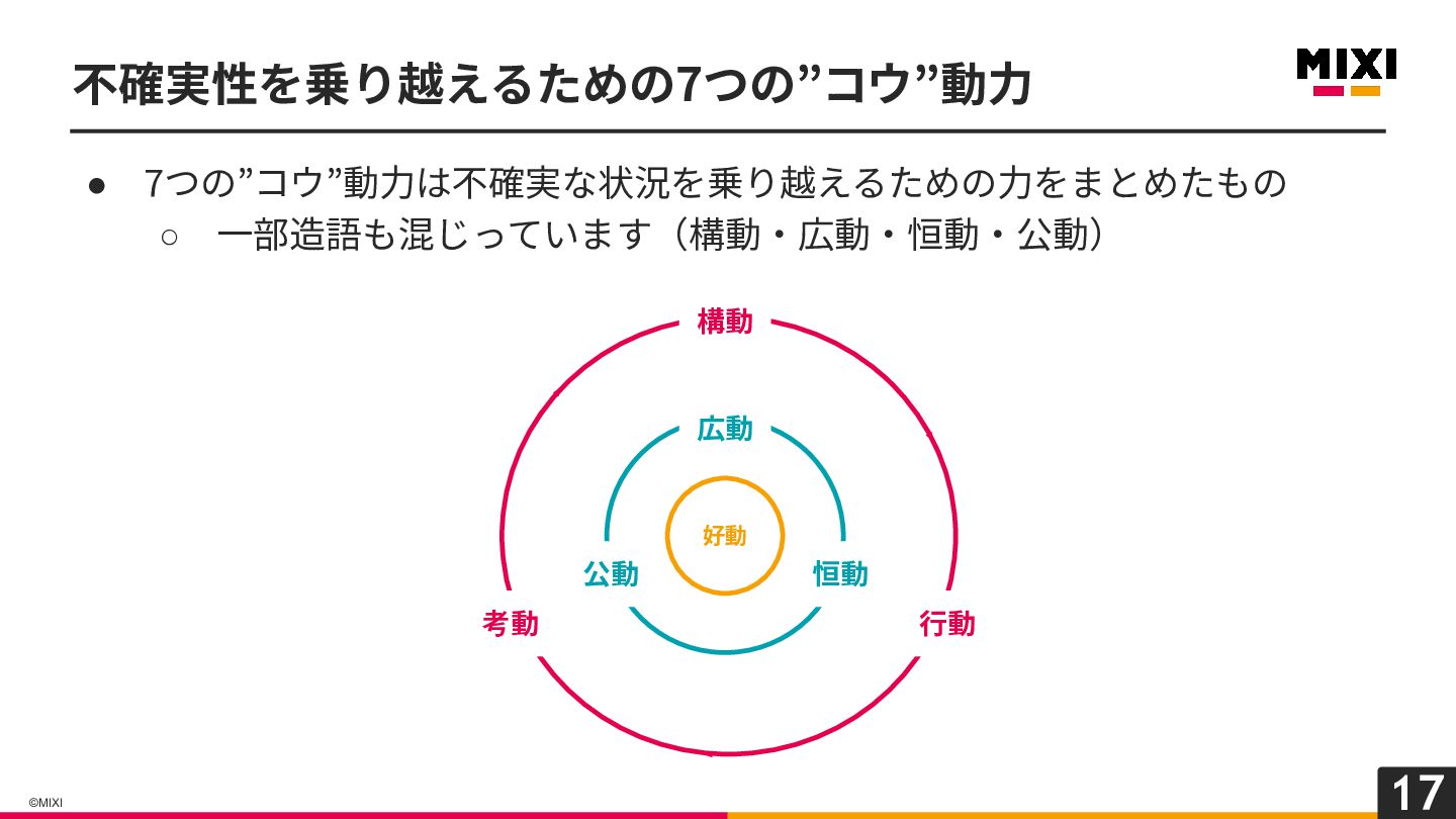 17 ©MIXI • 7つの”コウ”動⼒は不確実な状況を乗り越えるための⼒をまとめたもの ◦ ⼀部造語も混じっています(構動‧広動‧恒動‧公動) 不確実性を乗り越えるための7つの”コウ”動⼒ 好動 広動 恒動