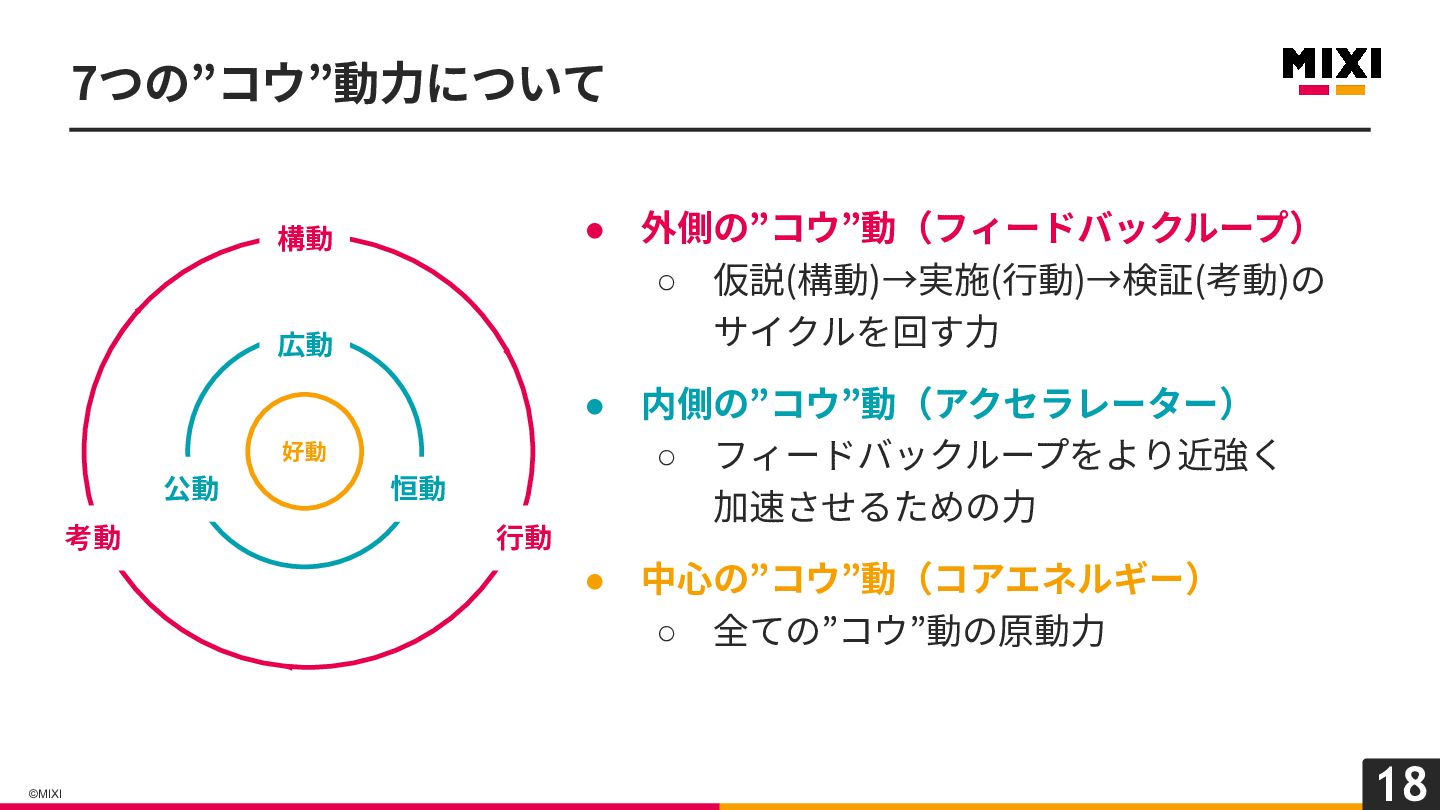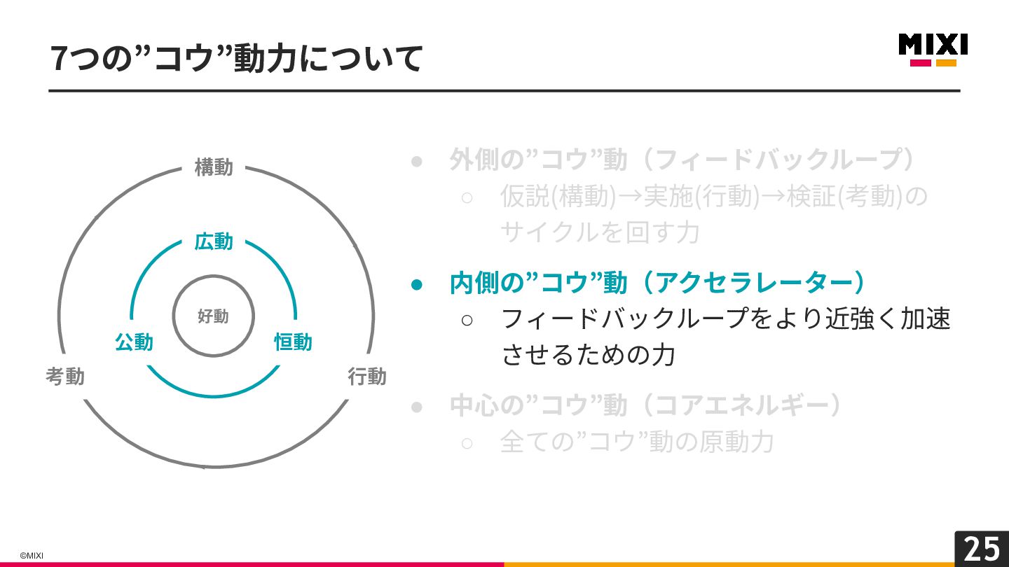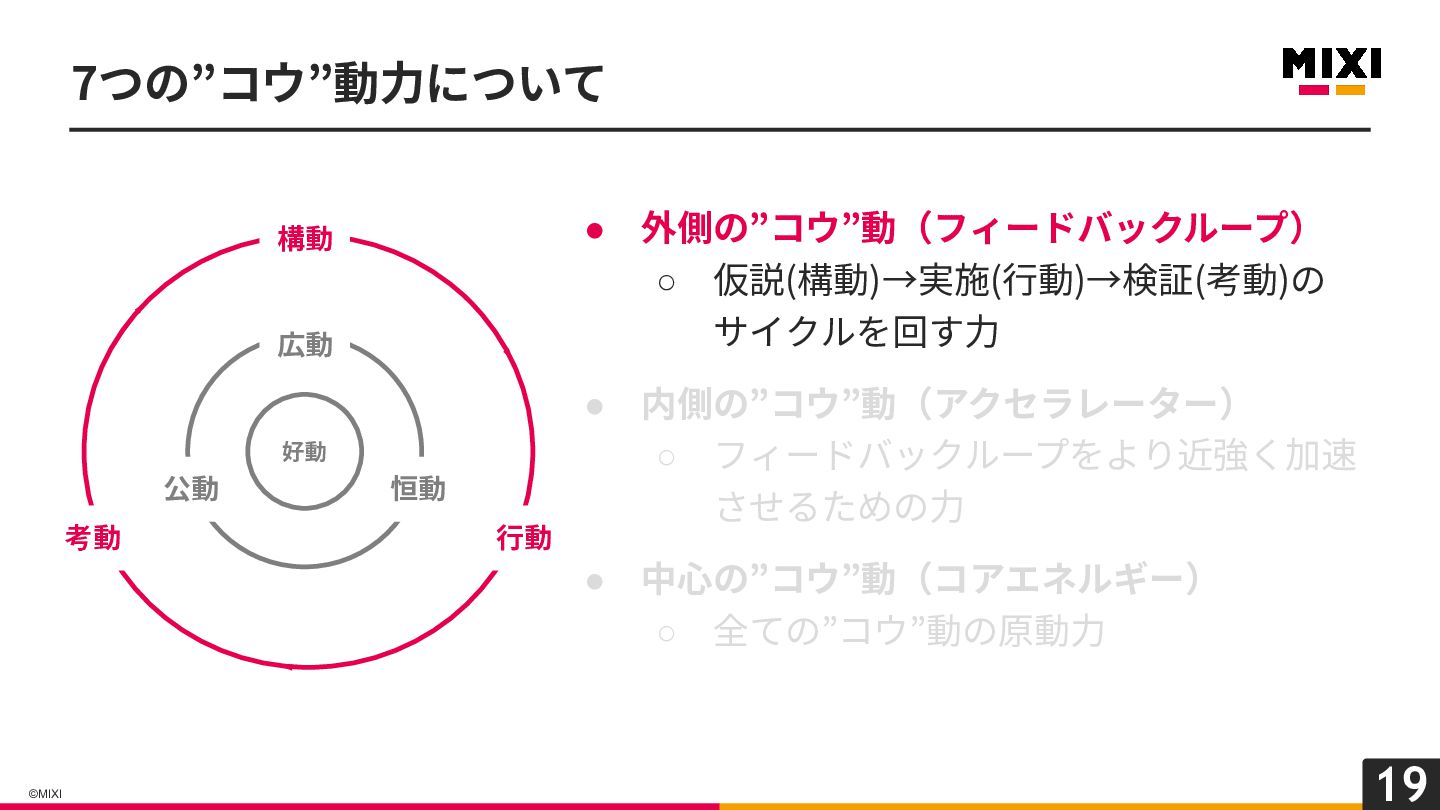 18 ©MIXI 7つの”コウ”動⼒について • 外側の”コウ”動(フィードバックループ) ◦ 仮説(構動)→実施(⾏動)→検証(考動)の サイクルを回す⼒ • 内側の”コウ”動(アクセラレーター)