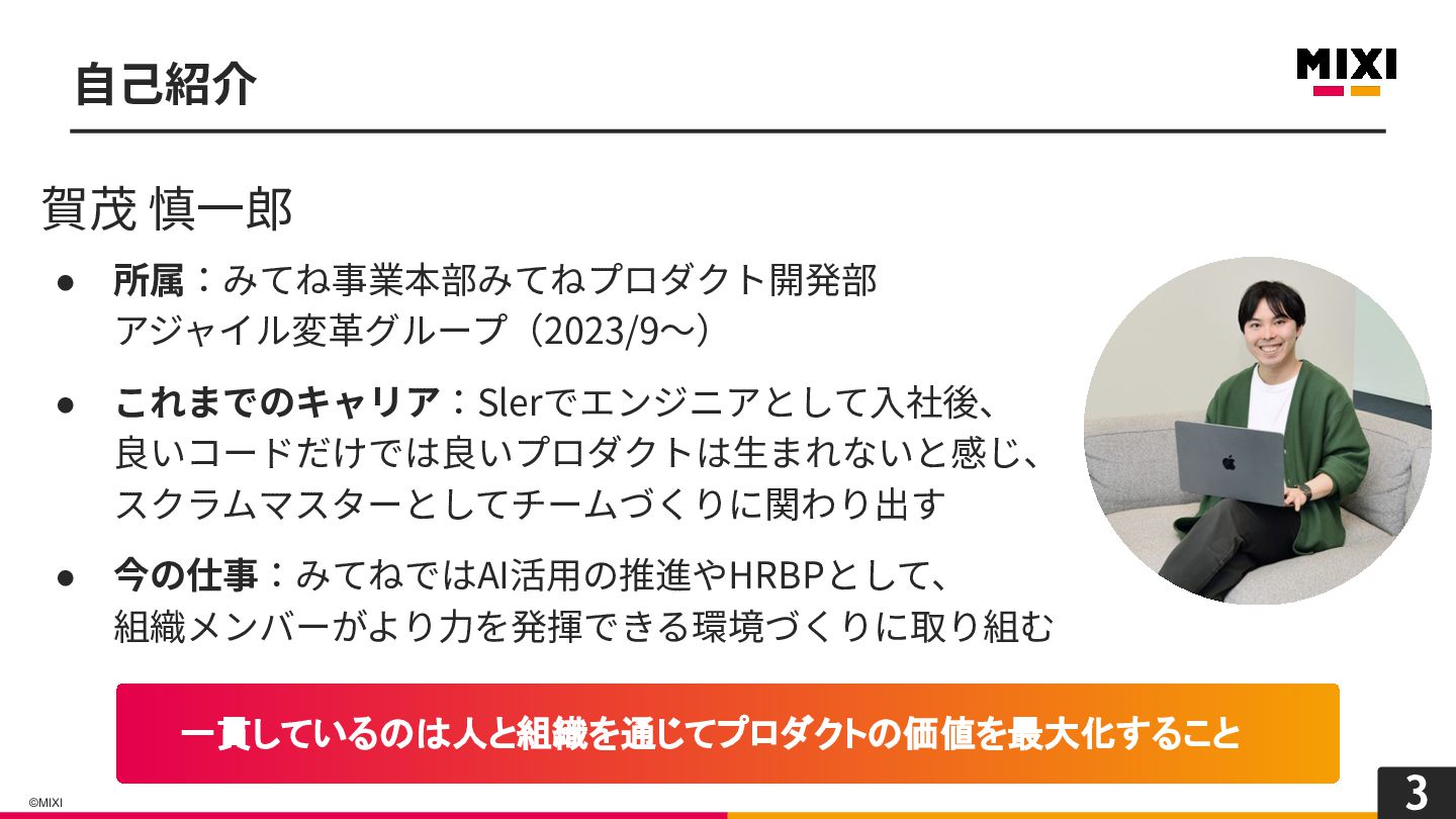 3 ©MIXI ⾃⼰紹介 賀茂 慎⼀郎 • 所属:みてね事業本部みてねプロダクト開発部 アジャイル変⾰グループ(2023/9〜) • これまでのキャリア:Slerでエンジニアとして⼊社後、