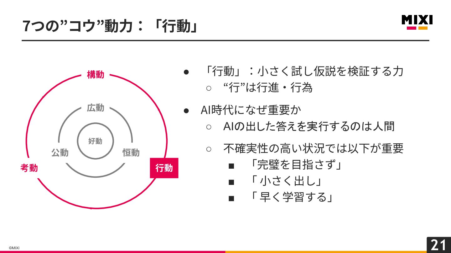 21 ©MIXI • 「⾏動」:⼩さく試し仮説を検証する⼒ ◦ “⾏”は⾏進‧⾏為 • AI時代になぜ重要か ◦ AIの出した答えを実行するのは人間