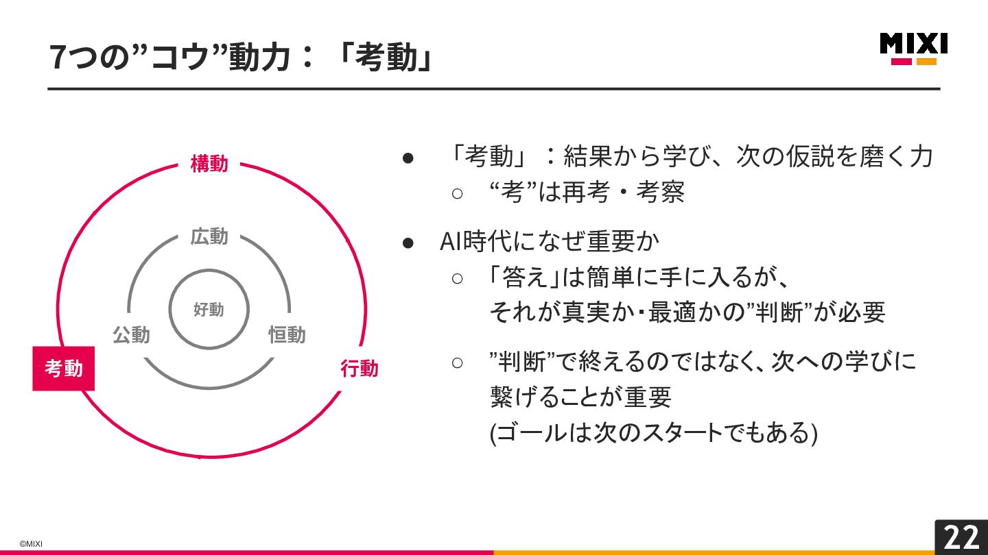 22 ©MIXI • 「考動」:結果から学び、次の仮説を磨く⼒ ◦ “考”は再考‧考察 • AI時代になぜ重要か ◦ 「答え」は簡単に手に入るが、