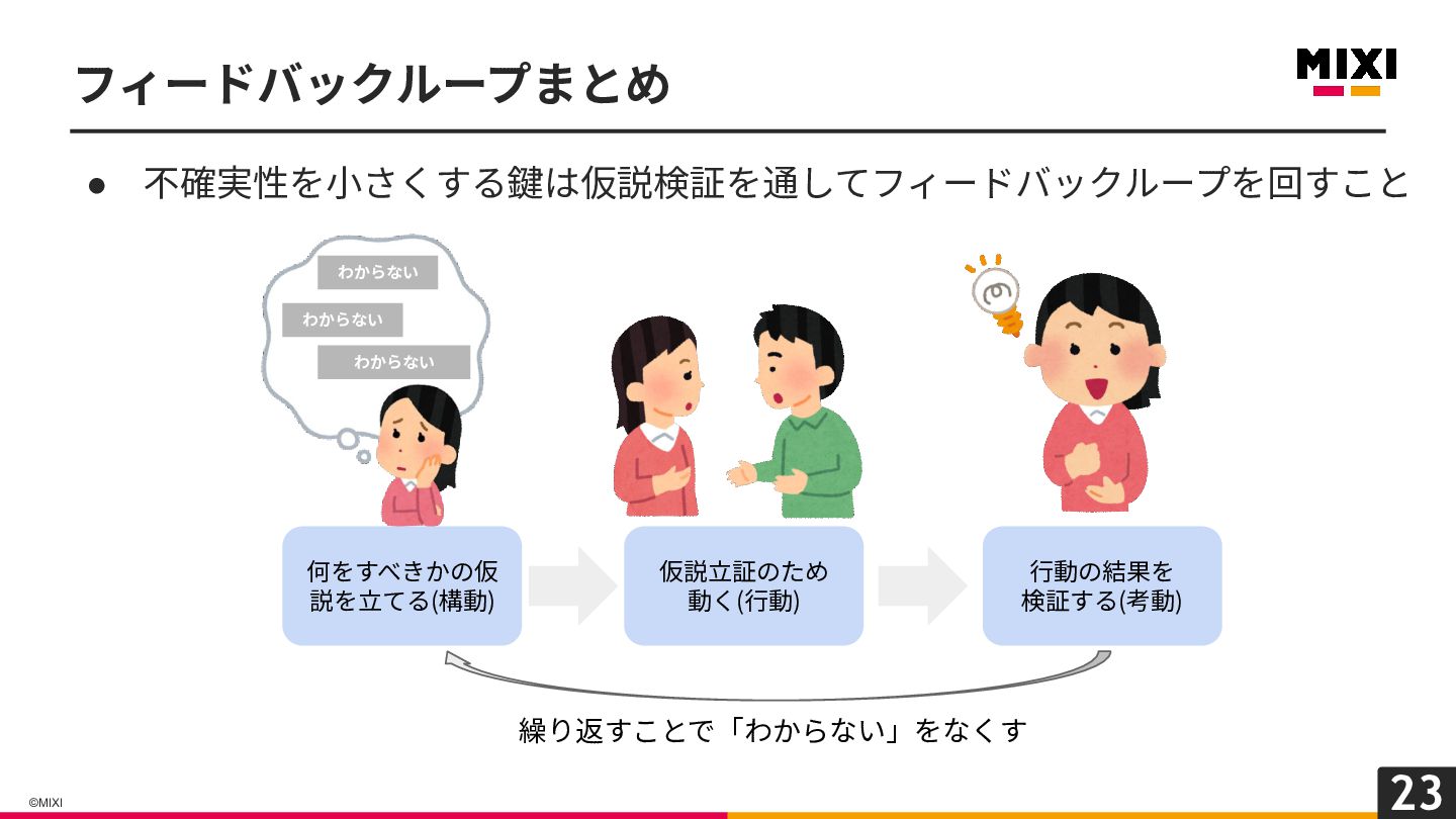 23 ©MIXI • 不確実性を⼩さくする鍵は仮説検証を通してフィードバックループを回すこと フィードバックループまとめ わからない わからない わからない 何をすべきかの仮 説を⽴てる(構動)